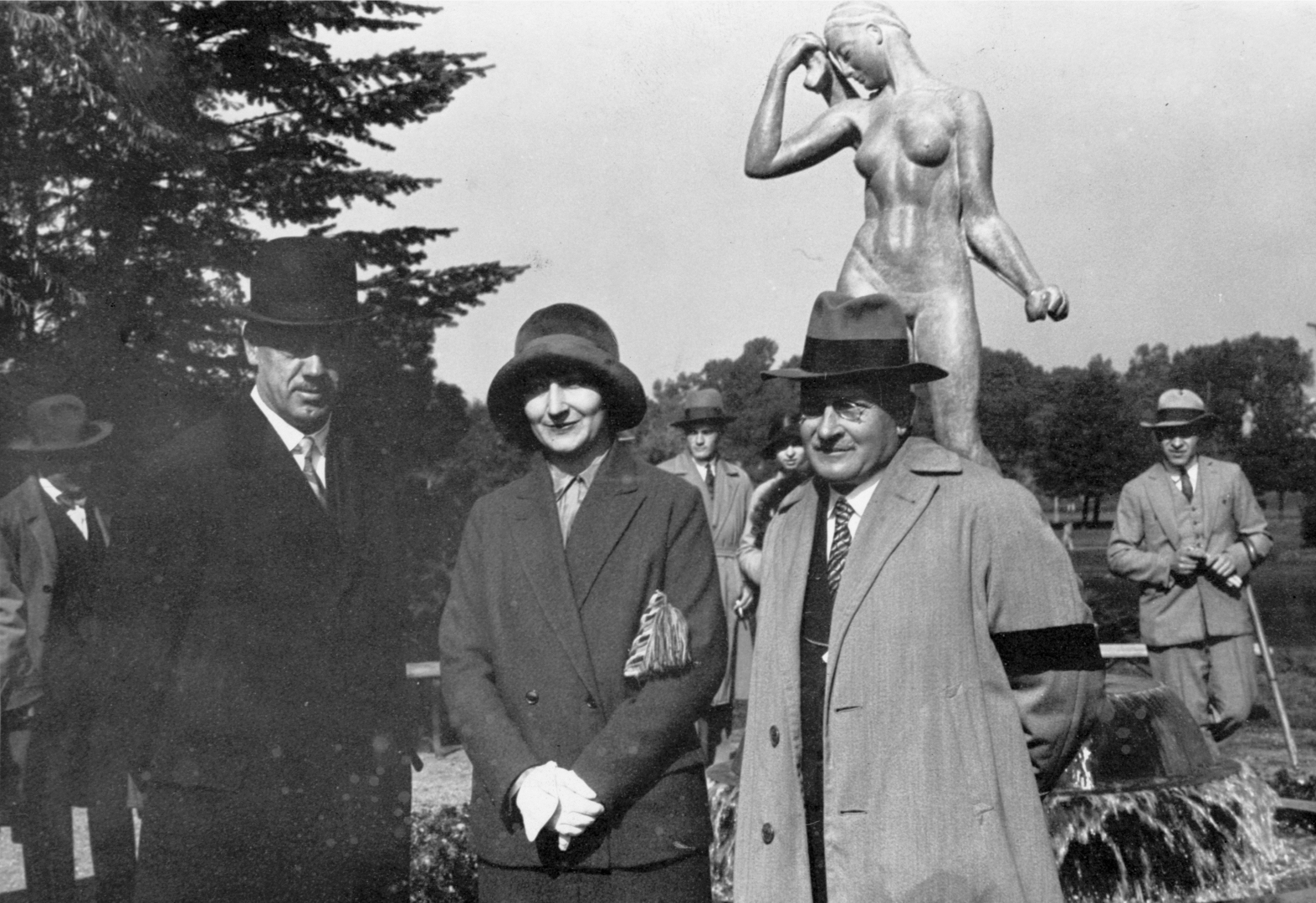 Widoczni od lewej prezydent Warszawy Zygmunt Słomiński, Olga Niewska, wiceprezes Rady Miejskiej Stanisława Wilczyński. W tle rzeźba Olgi Niewskiej "Kąpiąca się".