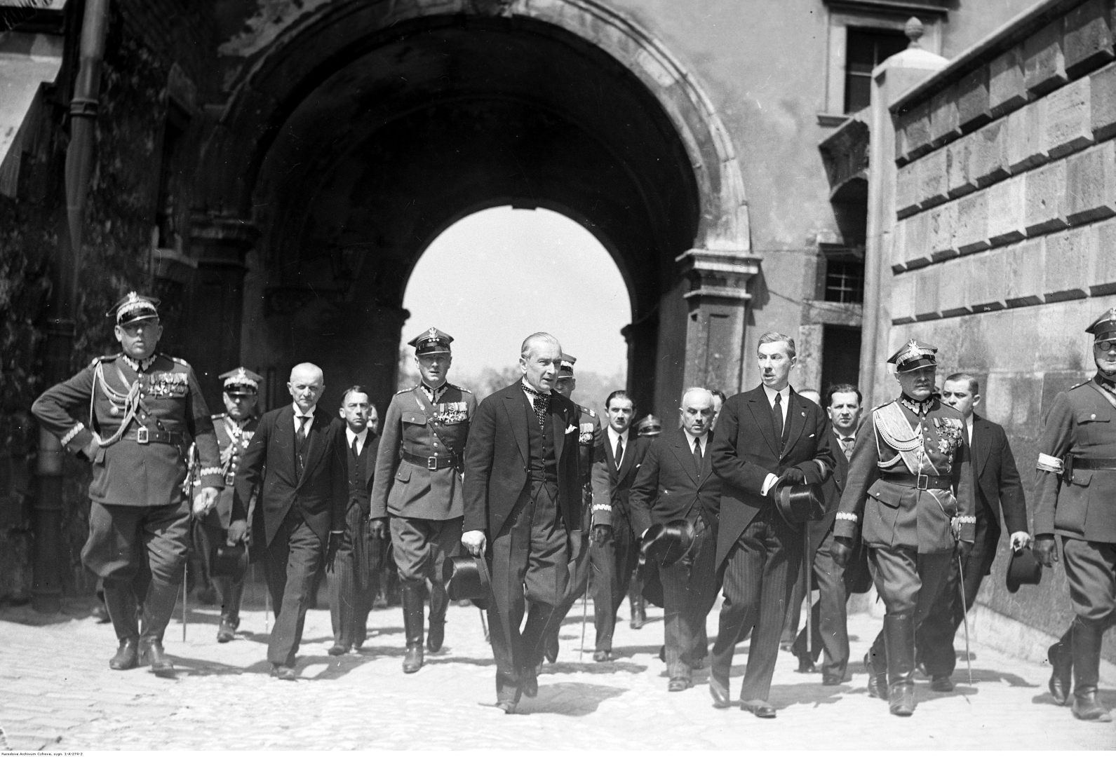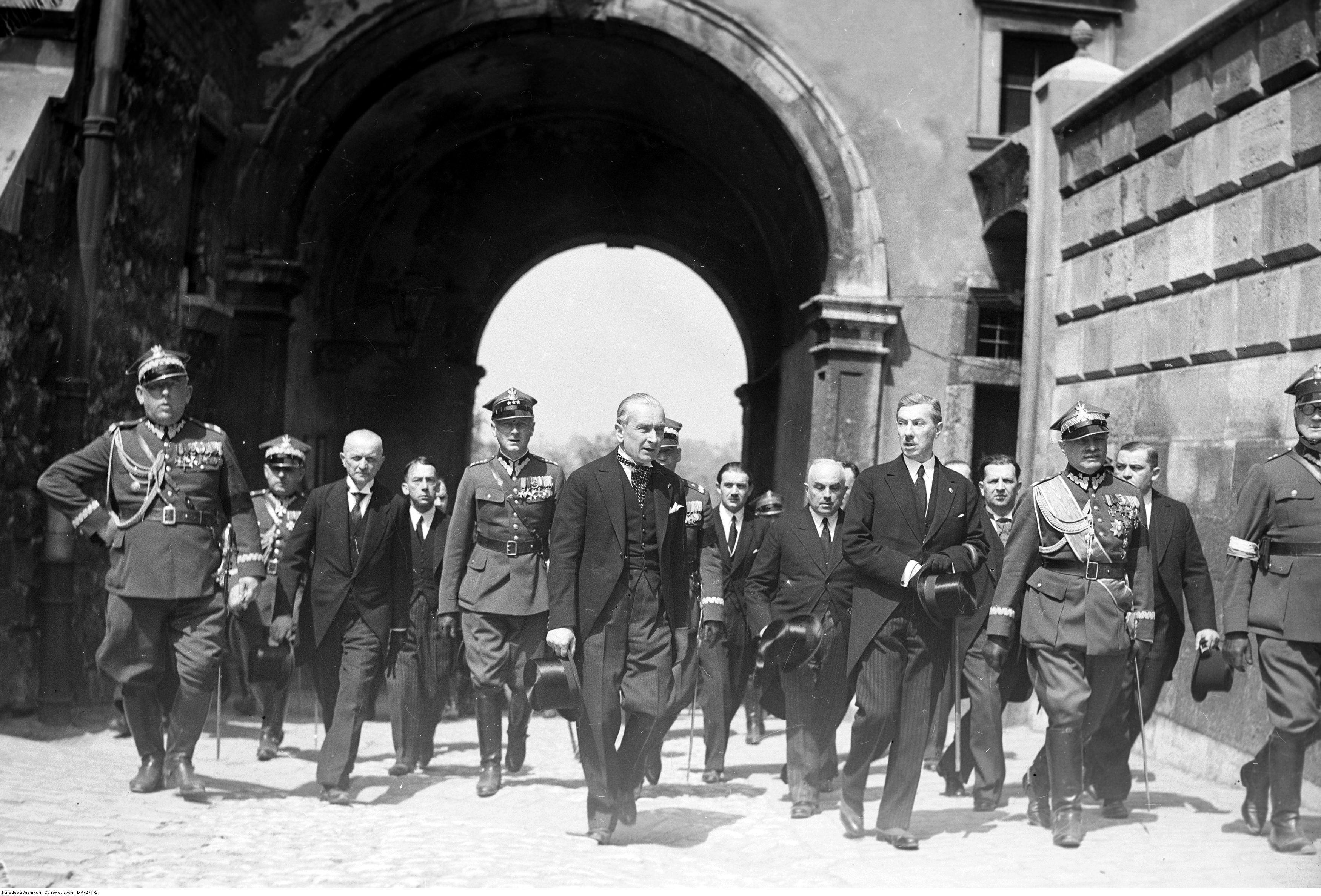 Przybycie dygnitarzy państwowych na Wawel. Widoczni m.in. w I rzędzie: generał Felicjan Sławoj Składkowski, wicepremier Eugeniusz Kwiatkowski, podsekretarz stanu w Prezydium Rady Ministrów Wacław Grzybowski, generał Bernard Mond, w II rzędzie: wicewojewoda krakowski Piotr Małaszyński, wiceminister skarbuTadeusz Grodyński, pułkownik Michał Gnoiński, prezes sądu apelacyjnego Franciszek Parylewicz.