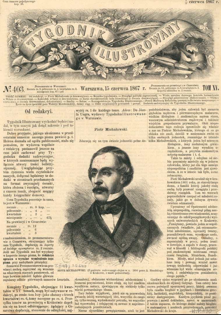 , Pierwsza strona czsopisma z 1867 roku z artykułem i portretem Piotra Michałowskiego., [w:] Polski słownik biograficzny, t. ,