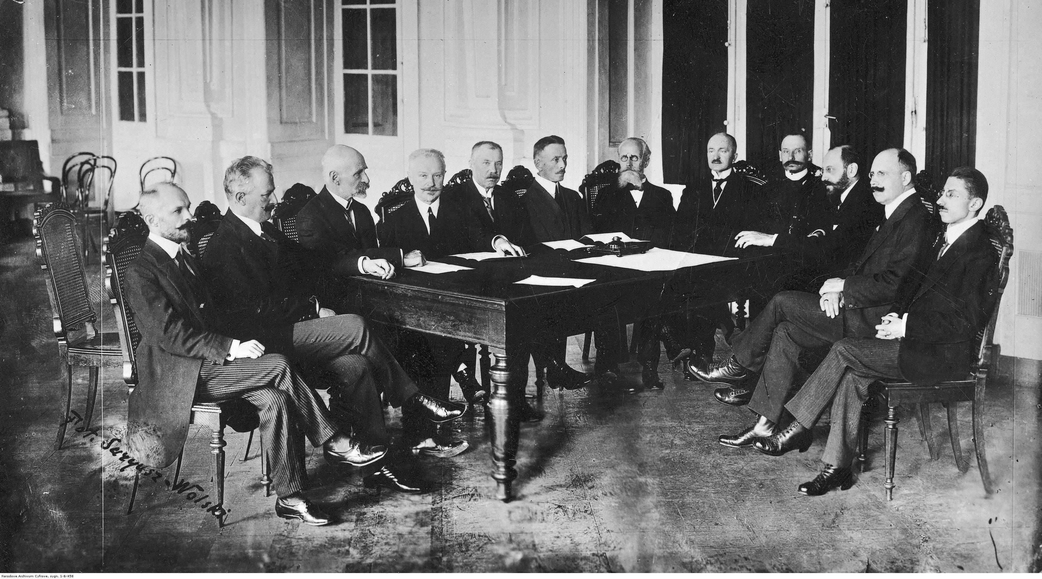 Zespół sędziowski siedzący przy stole. Widoczni: Aleksander Mogilnicki (1. z lewej), Stanisław Patek (2. z lewej), Leon Papieski (4. z lewej), Leon Supiński (5. z lewej), Ignacy Baliński (8. z lewej), Bolesław Pohorecki (11. z lewej), Emil Stanisław Rappaport (12. z lewej), Oskar Szeller, Stanisław Staniszewski, Józef Światopełk-Zawadzki, Stefan Cholewiński, K. Szterling.
