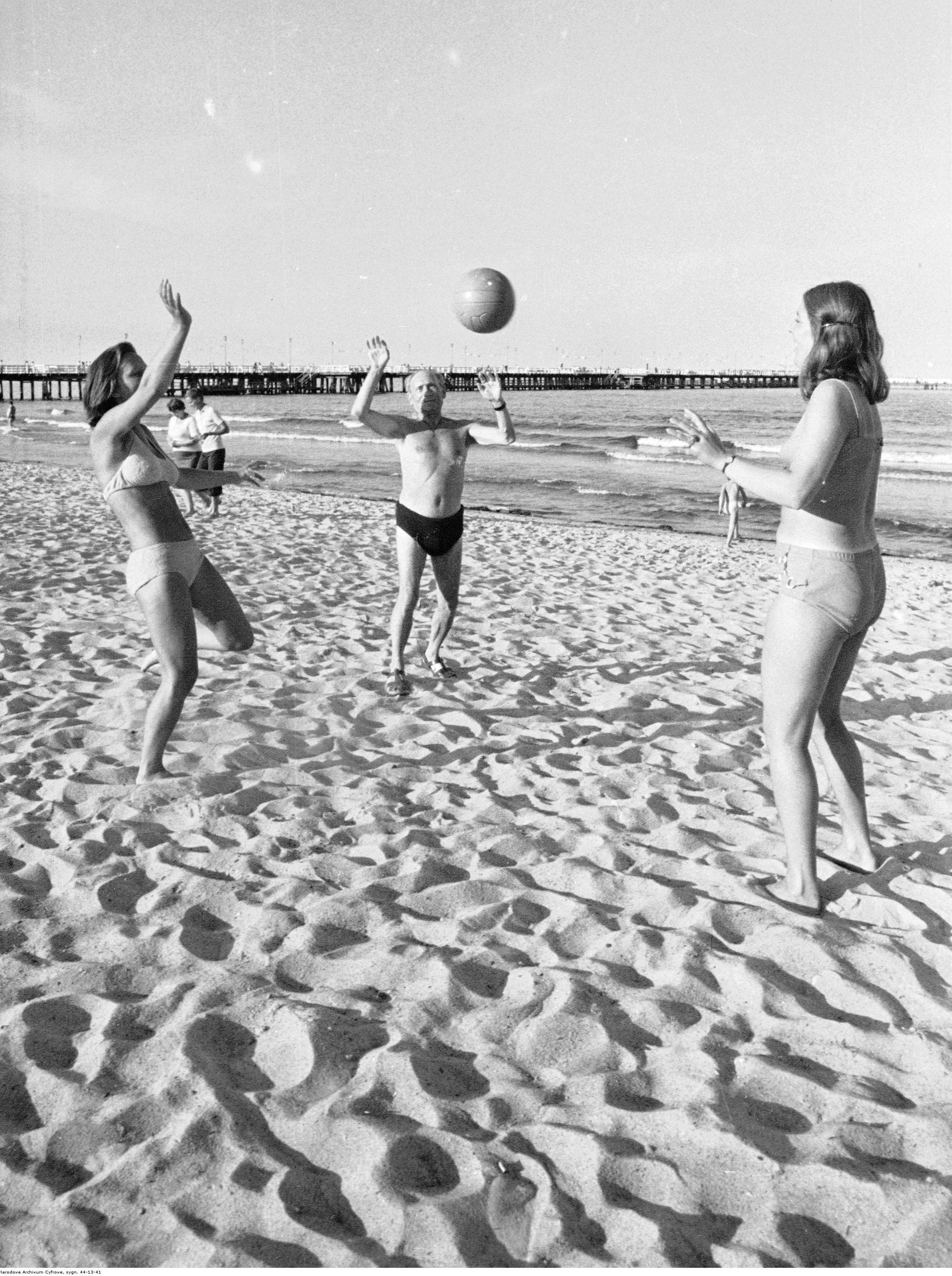 , Pisarz Julian Stryjkowski na plaży grający w piłkę w towarzystwie dwóch dziewczyn, sierpień 1975 r., [w:] Polski słownik biograficzny, t. ,