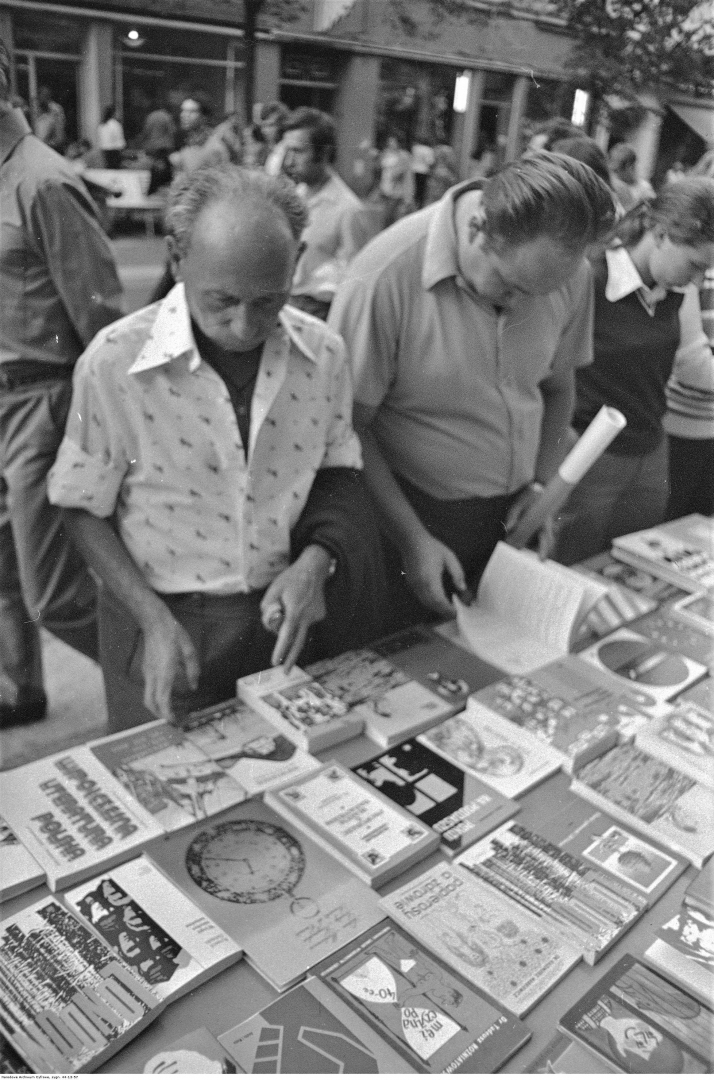 Pisarz Julian Stryjkowski przy straganie z książkami w sierpniu 1975 r., [online] Warszawa: Narodowy Instytut Audiowizualny [dostęp 19.04.2026]. Dostępny w internecie: http://www.biogramy.pl/a/foto/pisarz-julian-stryjkowski-przy-straganie-z-ksiazkami-w-sierpniu-1975-r