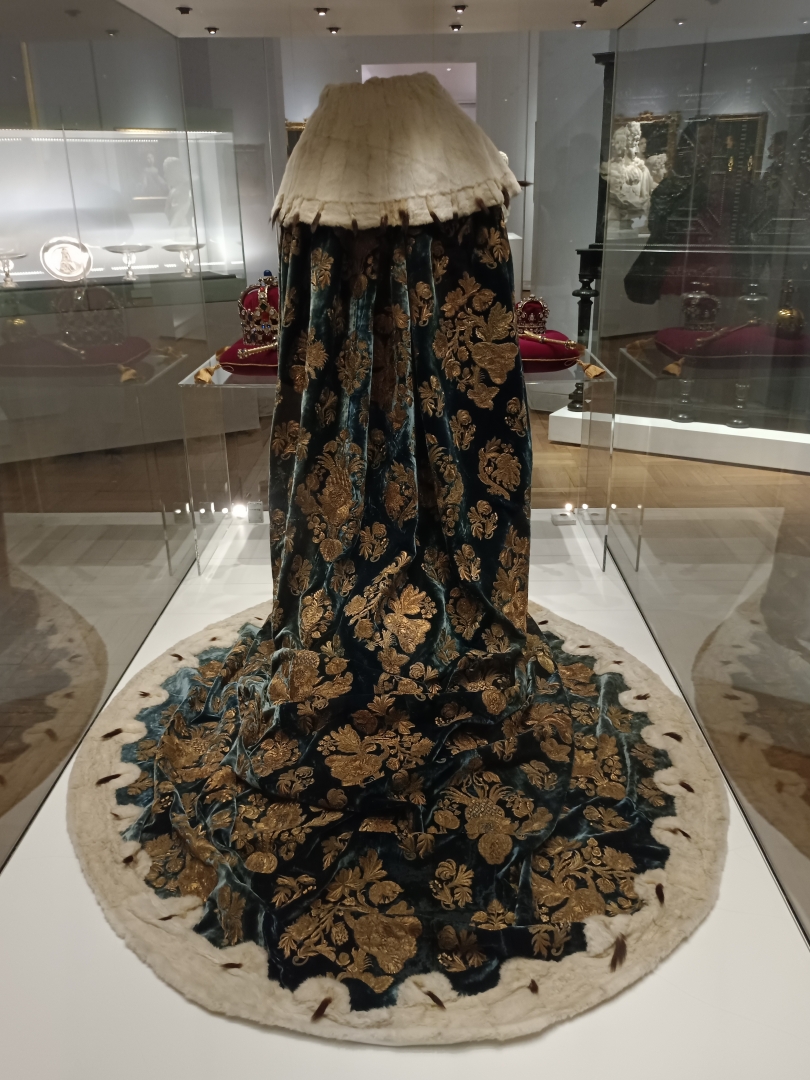 Płaszcz koronacyjny i widoczne na drugim planie insygnia zostały użyte 17 stycznia 1734 roku w katedrze wawelskiej podczas koronacji Augusta III i jego żony Marii Józefy.