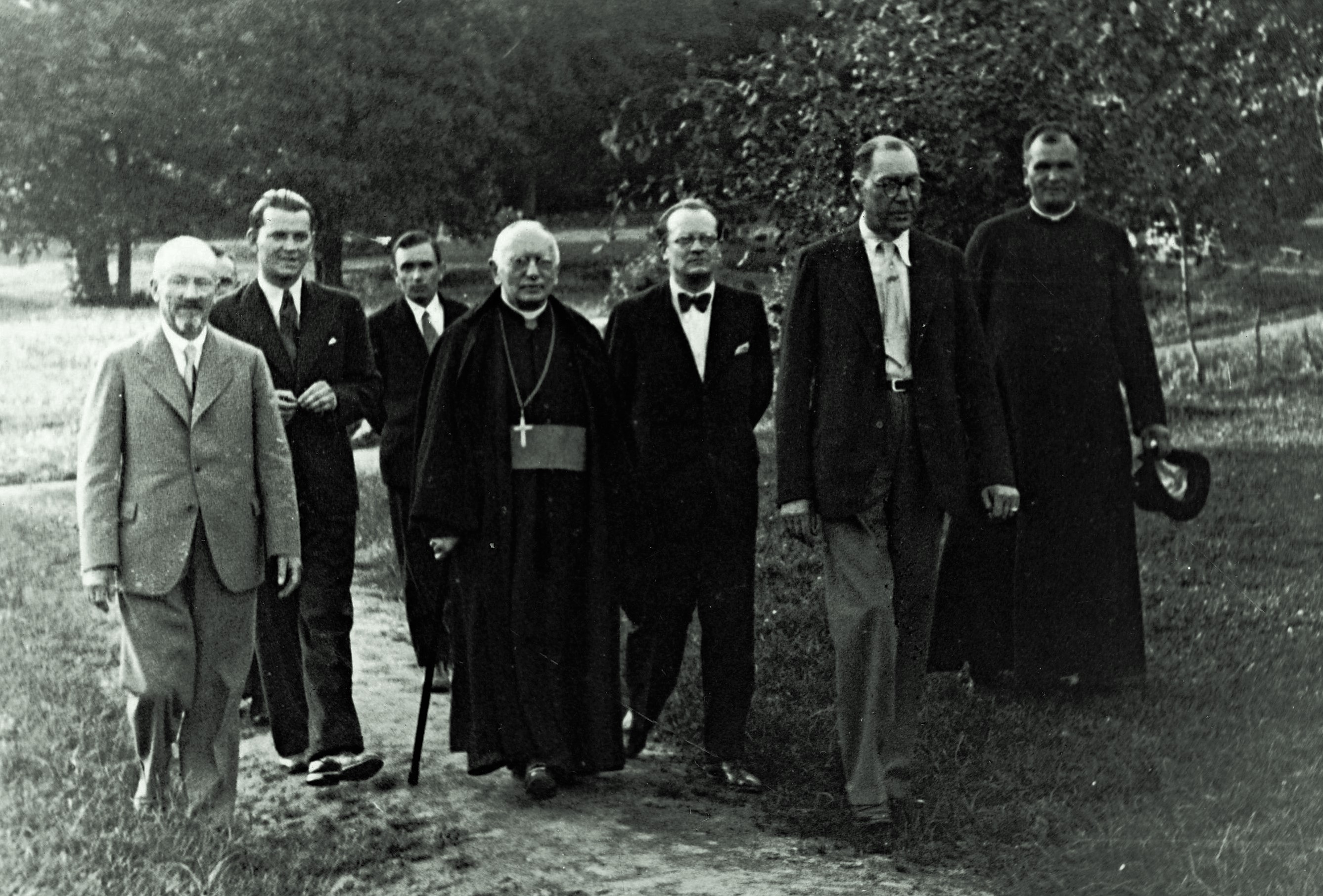 Ks. arcybiskup Bolesław Twardowski (podpiera się laską) przed budynkiem łaźni borowinowych i siarkowych w otoczeniu m.in.: ks. kan. Teichmana (pierwszy z prawej z kapeluszem w ręku), właściciela Horyńca i prezesa Związku Uzdrowisk Polskich senatora Stanisława Karłowskiego (drugi z prawej), naczelnego lekarza zdrojowego Pieniążka, hr. K. Krusensterna i dyr. hr. J. Krusensterna.