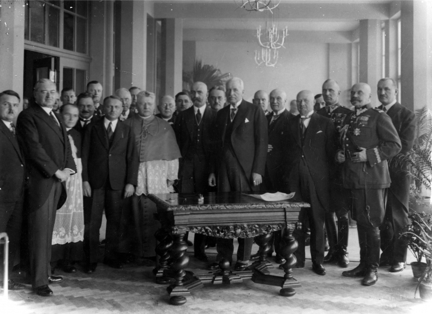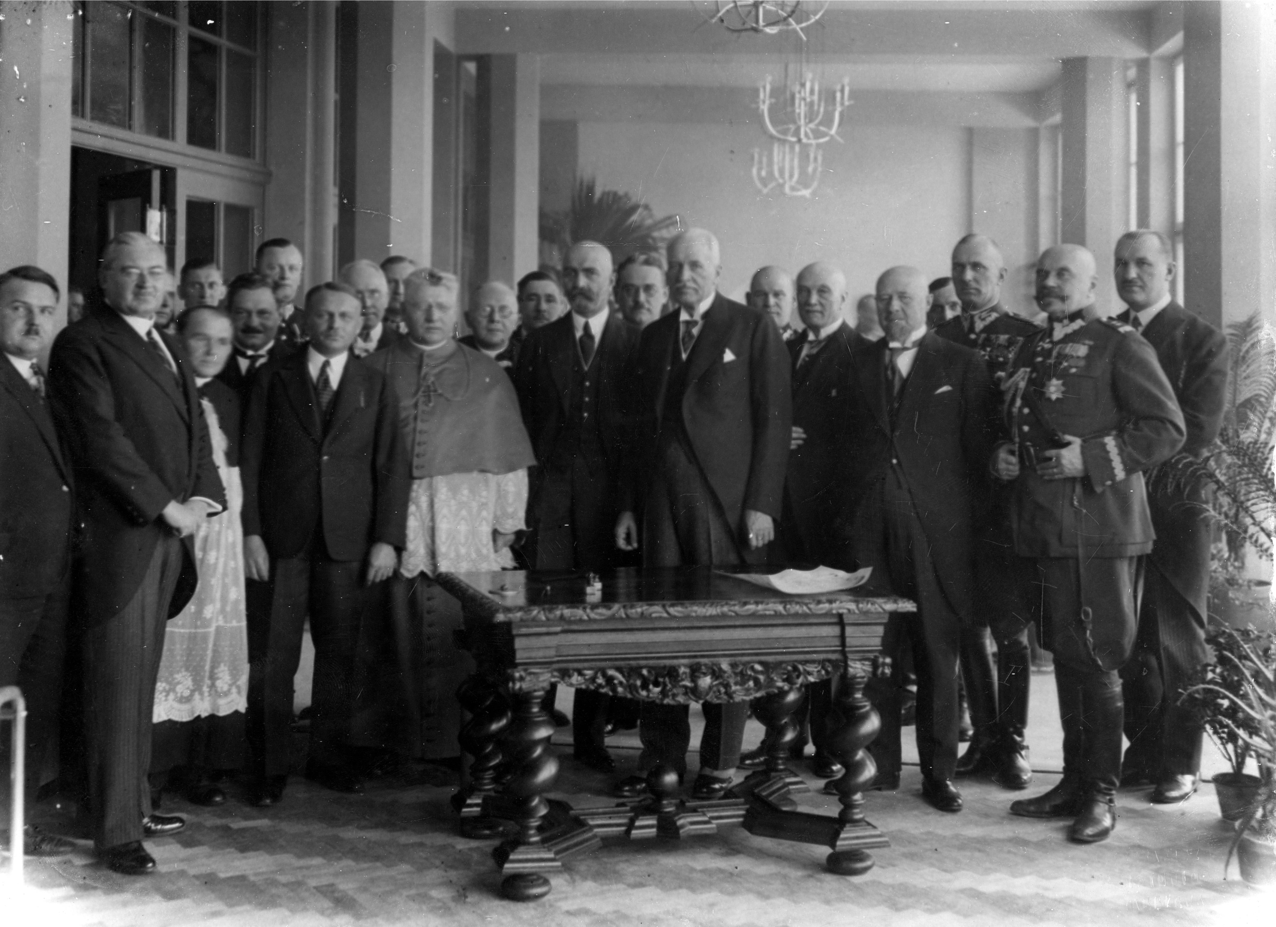 Uroczystość poświęcenia Zameczku i podpisania aktu erekcyjnego. Widoczni m.in. prezydent RP Ignacy Mościcki, premier Walery Sławek, minister przemysłu i handlu Aleksander Prystor, inżynier Adolf Szyszko-Bohusz, wojewoda śląski Michał Grażyński, biskup śląski Stanisław Adamski, szef Kancelarii Cywilnej Prezydenta RP Adam Lisiewicz (1. z prawej), wiceminister spraw wojskowych generał Daniel Konarzewski (2. z prawej), szef Gabinetu Wojskowego Prezydenta RP płk Jan Głogowski (na lewo za gen. Konarzewskim).