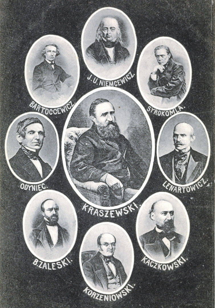 Na kompozycji wydoczni są: Teofil Lenartowicz, Antoni Edward Odyniec, Julian Ursnyn Niemcewicz, Józef Ignacy Kraszewski, Józef Bohdan Zaleski, Władysław Syrokomla, Zygmunt Kaczkowski i Józef Korzeniowski.