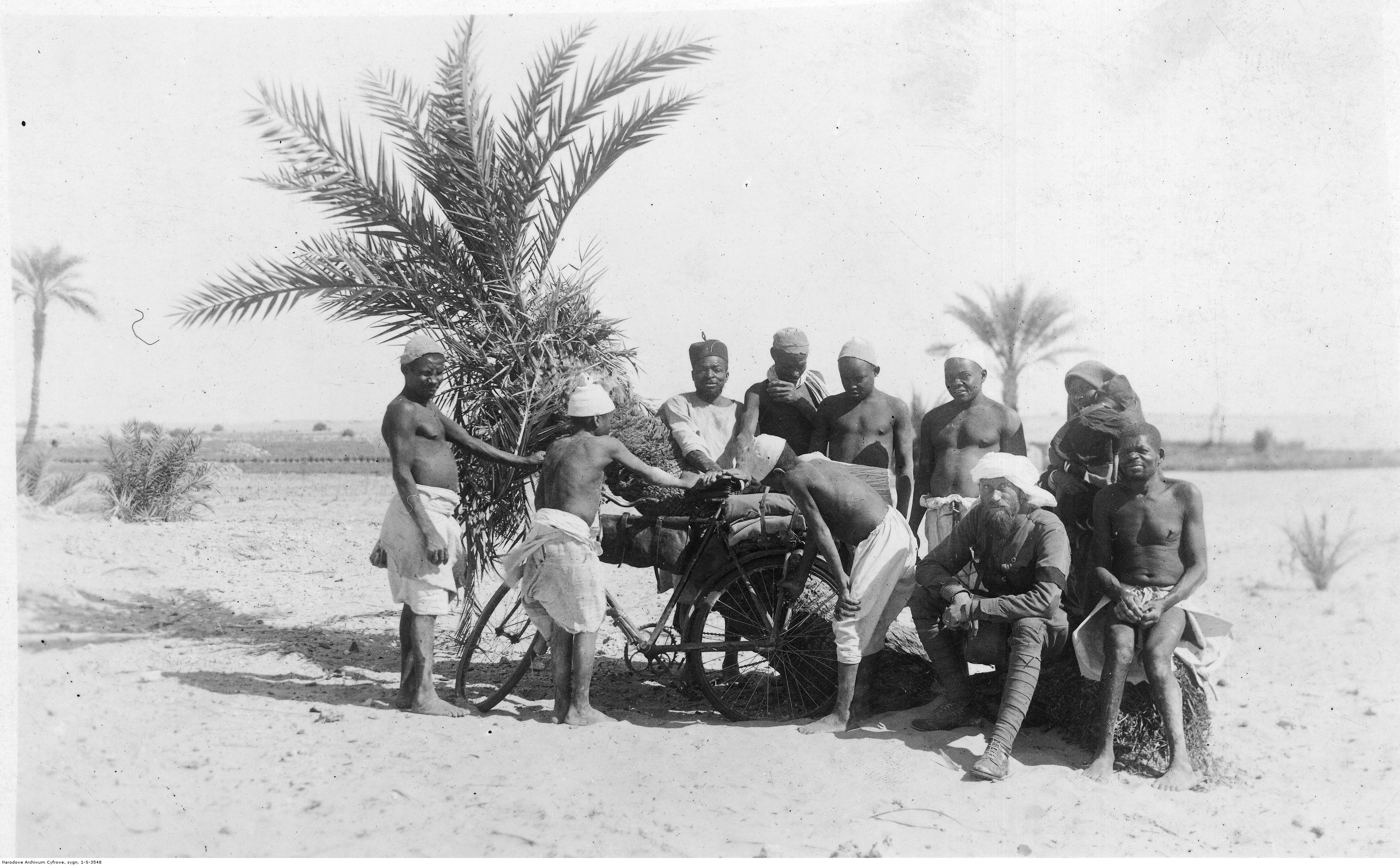 , Podróżnik Kazimierz Nowak w towarzystwie tubylców, którzy oglądają rower z załadowanym ekwipunkiem., [w:] Polski słownik biograficzny, t. ,