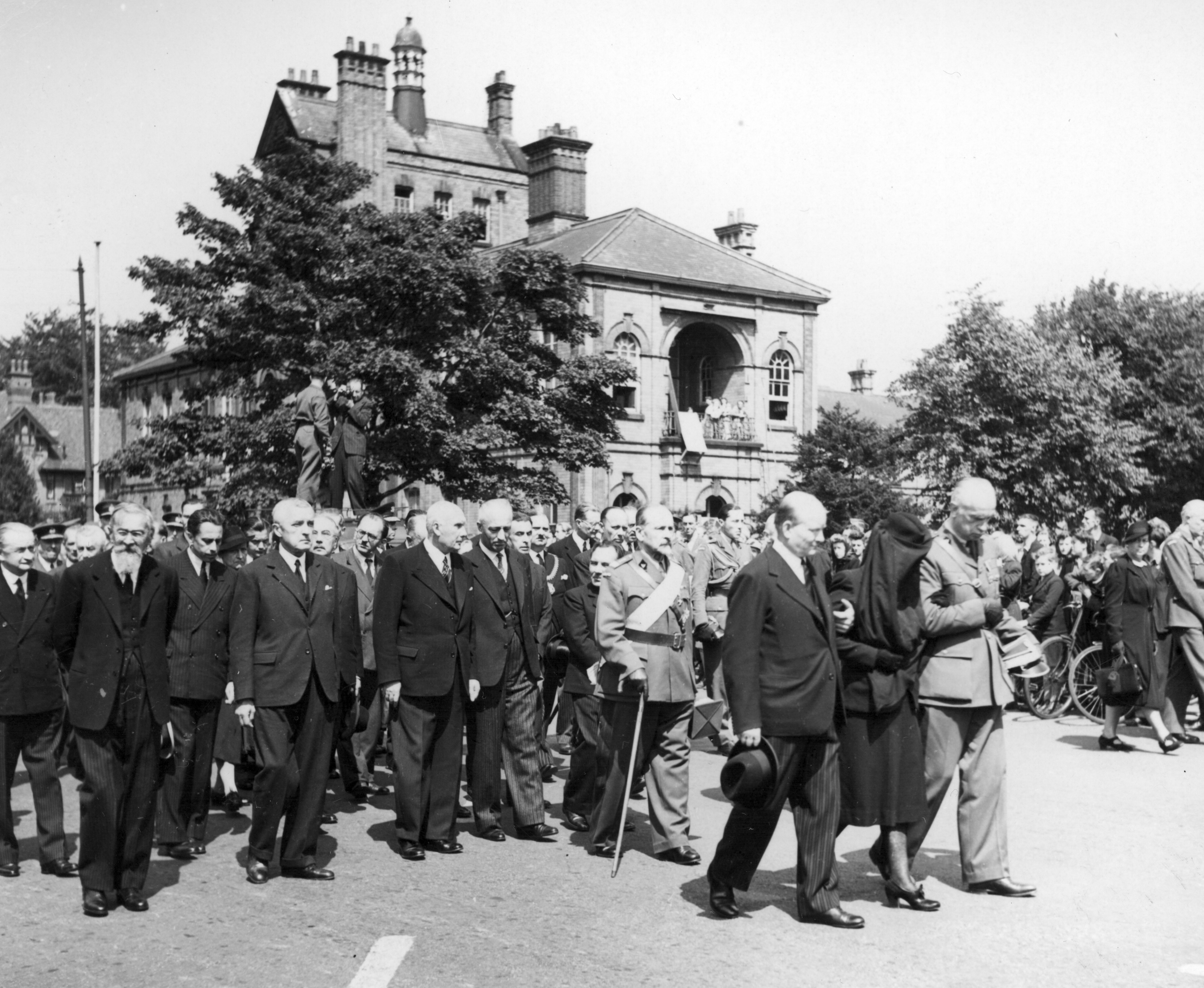 Kondukt na ulicach miasta. Na początku od lewej: premier Stanisław Mikołajczyk, Helena Sikorska, gen. Kazimierz Sosnkowski. Za nimi gen. Józef Haller. W następnym szeregu od lewej: Stanisław Grabski - przewodniczący Rady Narodowej, minister Marian Seyda, wicepremier Jan Kwapiński, minister Karol Popiel, minister Jan Stańczyk. Widoczni także m.in.: minister Henryk Strasburger, minister Stanisław Kot, minister Tadeusz Romer, minister Władysław Banaczyk, ambasador Edward Raczyński. Fotografię wykonał Czesław Datka.