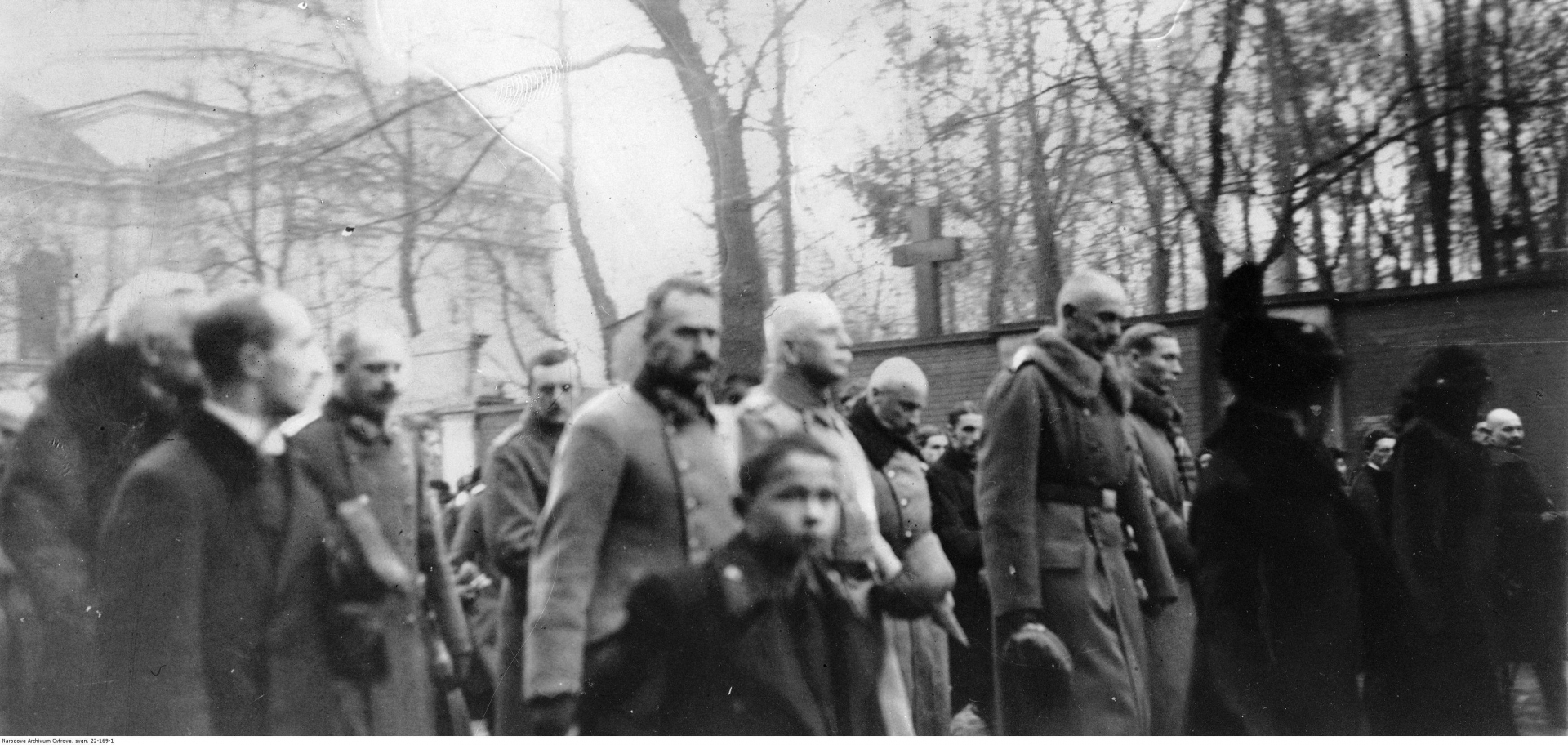 Widoczny m .in.: Józef Piłsudski (5. z lewej). Zdjęcie zrobione na tle murów Cmentarza Wojskowego na Powązkach oraz Kościoła św. Karola Boromeusza.
