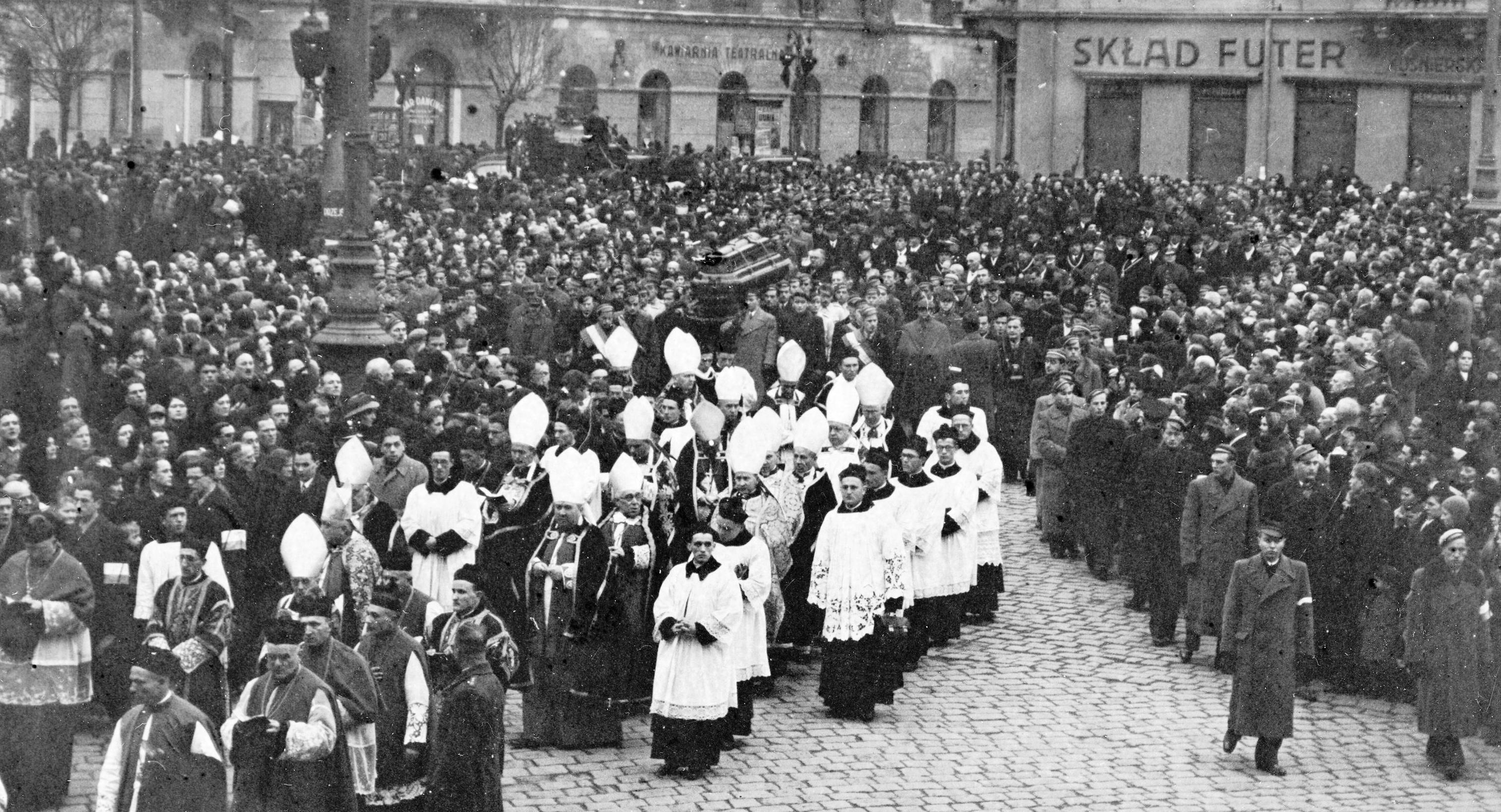 Kondukt na ulicach miasta. Widoczni w ostatnim rzędzie (w mitrach na głowie) m.in.: biskup pomocniczy przemyski Wojciech Tomaka, biskup piński Kazimierz Bukraba, biskup przemyski Franciszek Barda.
