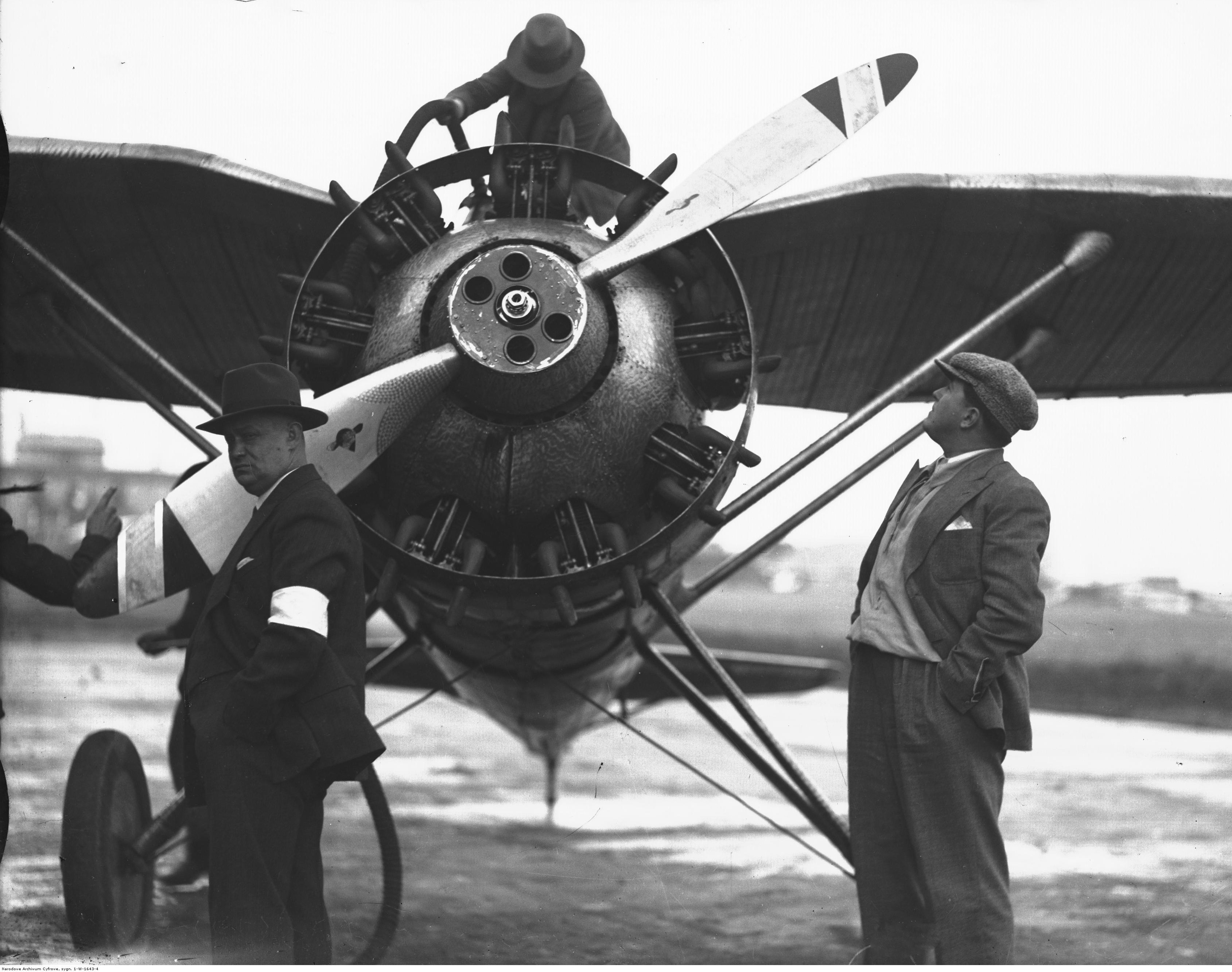 Kpt. Bolesław Orliński w stroju cywilnym tankuje swój samolot PZL P.6.