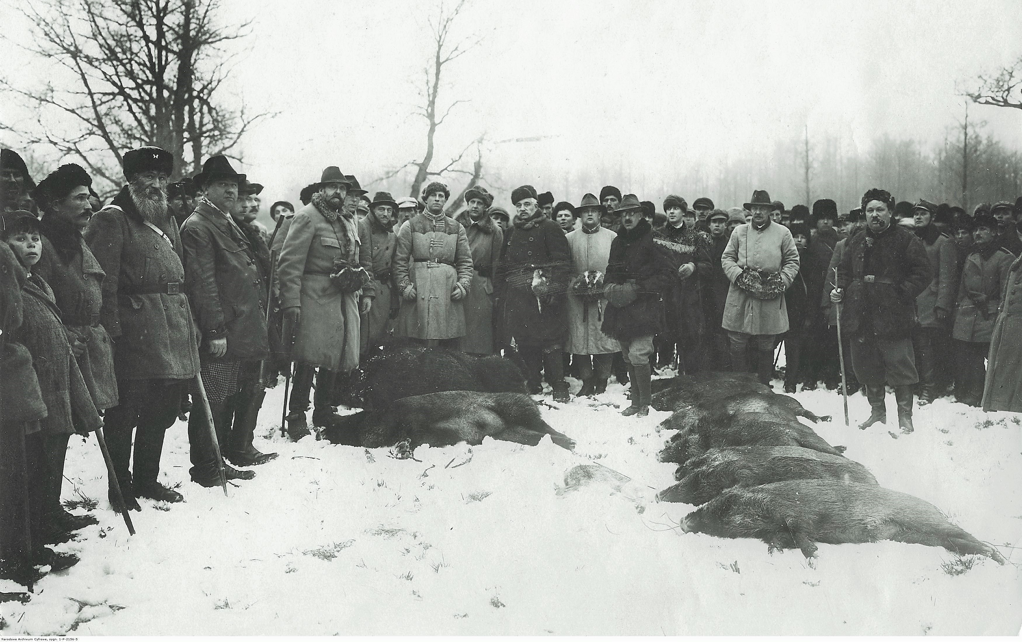 Wśród uczestników polowania przy upolowanych dzikach widoczni są m.in.: hrabia Zdzisław Tarnowski (piąty z lewej z brodą), hrabia Jarzy Potocki (za hrabią Tarnowskim), hrabia Szołdrski (drugi na prawo od hrabiego Tarnowskiego), hrabia Roman Potocki (trzeci na prawo od hrabiego Tarnowskiego), arcyksiążę Karol Obracht Habsburg (czwarty na prawo od hrabiego Tarnowskiego), hrabia Tomasz Zamoyski (w środku w ciemnym płaszczu), hrabia Paweł Potocki (w środku w jasnym płaszczu), książę Hieronim Radziwiłł (z prawej w kapeluszu i okularach), hrabia Benedykt Tyszkiewicz (na prawo za księciem Hieronimem), hrabia Maurycy Zamoyski (z prawej w jasnym płaszczu) i książę Karol Mikołaj Radziwiłł (z prawej z kijem).