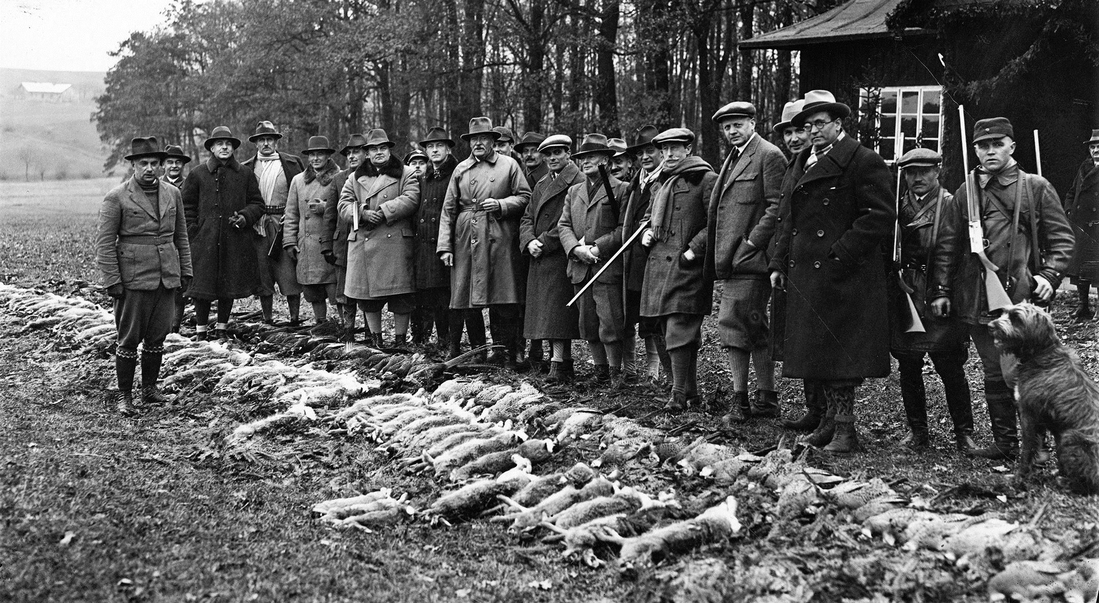 Grupa uczestników polowania przy upolowanej zdobyczy. Widoczni m.in.: prezydent RP Ignacy Mościcki, radca w MSZ Michał Mościcki, szef Gabinetu Wojskowego Prezydenta RP płk Jan Głogowski, gen. Kazimierz Sosnkowski, gen. Edward Rydz - Śmigły, poseł i minister pełnomocny Czechosłowacji w Polsce Vaclav Girsa, minister spraw zagranicznych August Zaleski, poseł niemiecki w Polsce Hans Adolf von Moltke, ambasador brytyjski w Polsce William Erskine, dyrektor Protokołu Dyplomatycznego Ministerstwa Spraw Zagranicznych Karol Romer, wiceminister skarbu Tadeusz Lechnicki, ambasador Włoch w Polsce Giuseppe Bastianini, wiceminister reform rolnych Wacław Karwacki, minister sprawiedliwości Czesław Michałowski, Wielki Łowczy Koronny inż. Herman Knothe. Myśliwy 1. z prawej trzyma automatyczną strzelbę śrutową Browning A-5.