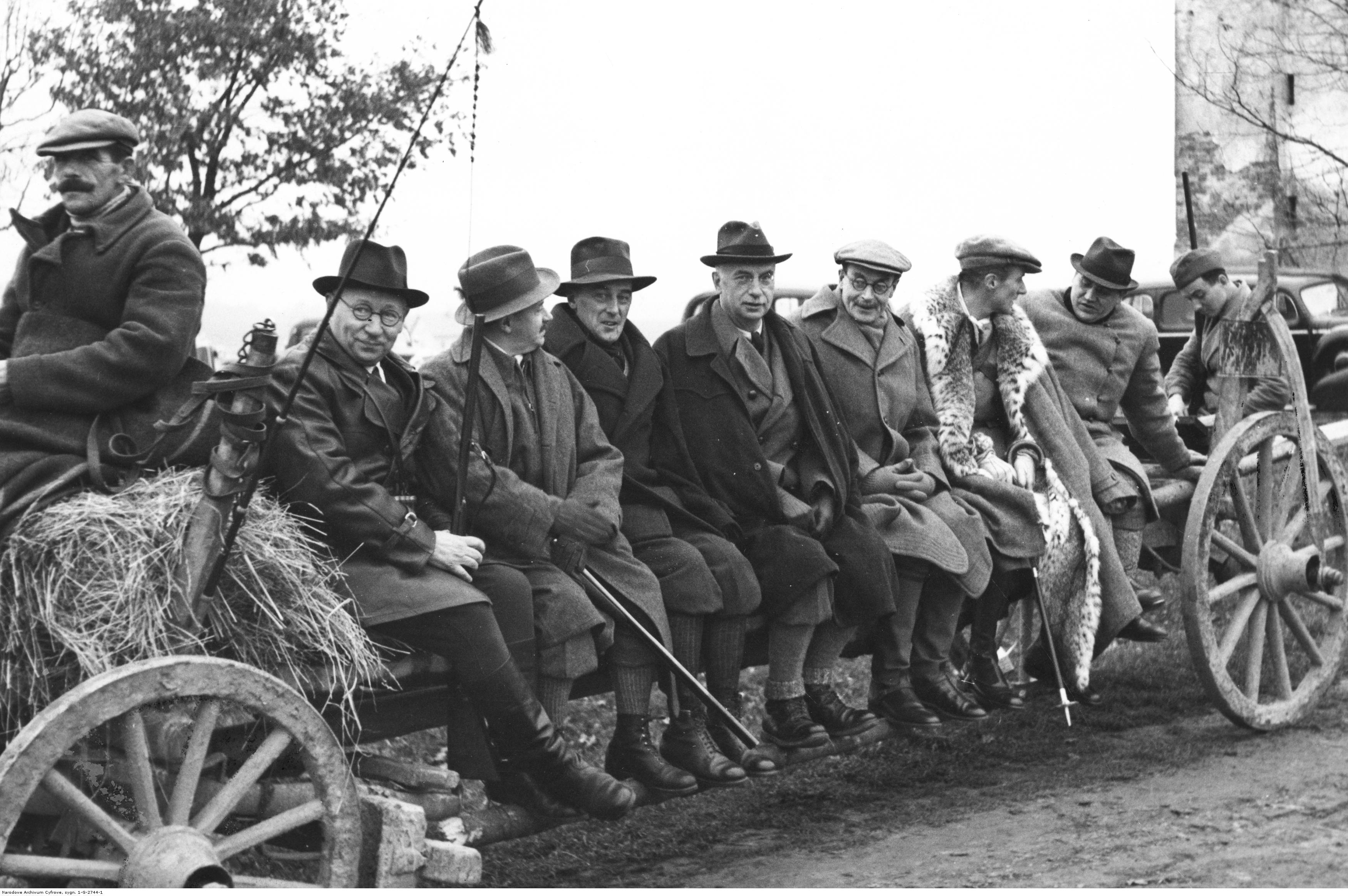 Uczestnicy polowania. Siedzą od lewej: minister wyznań religijnych i oświecenia publicznego Wojciech Świętosławski, minister opieki społecznej Marian Zyndram Kościałkowski, gen. Władysław Bortnowski, gen. Kazimierz Sosnkowski, ambasador brytyjski Howard William Kennard, ambasador USA Anthony Drexel - Biddle, poseł litewski Kazys Škirpa.