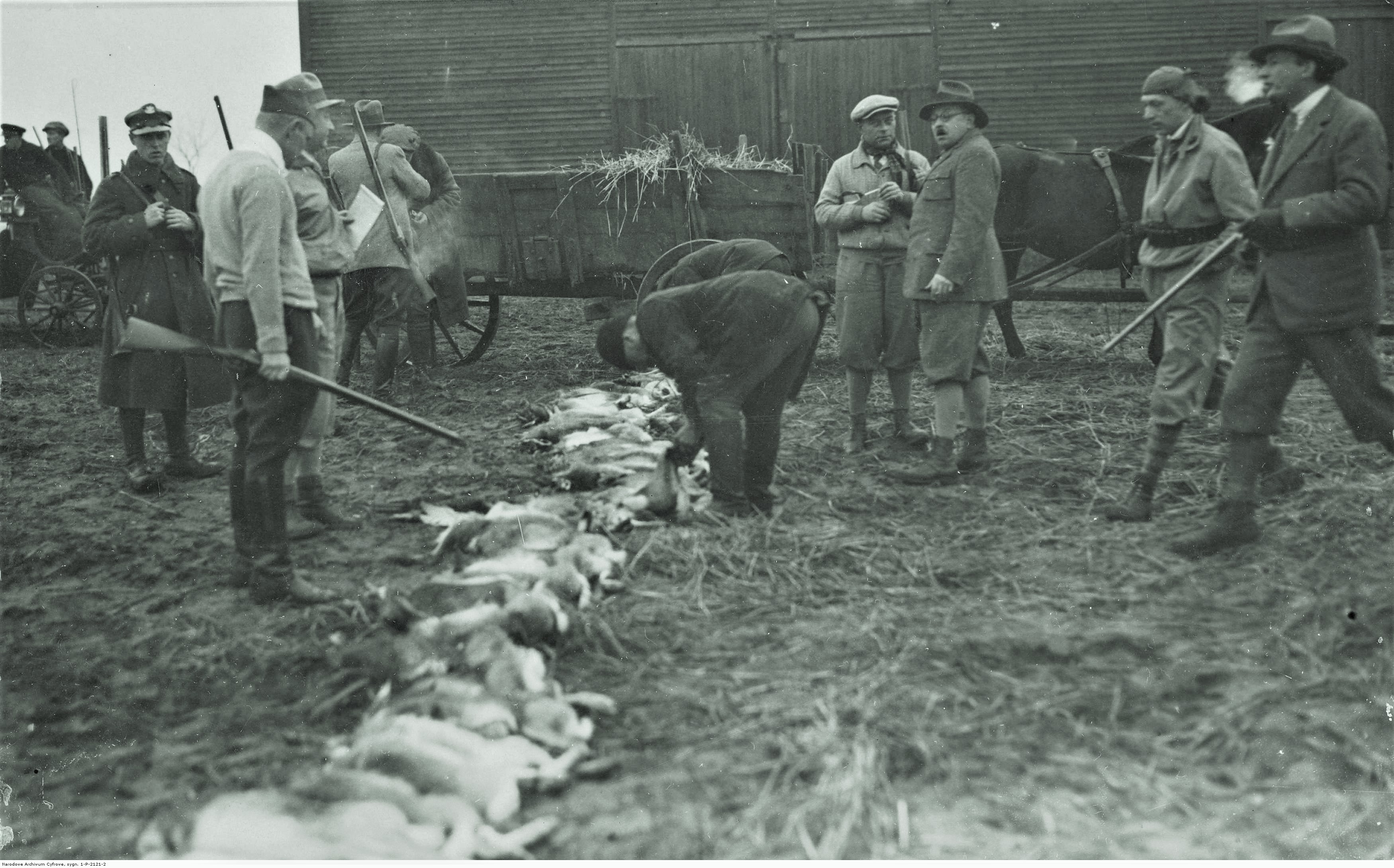 Uczestnicy polowania przy upolowanych zającach. Widoczni m.in.: hrabia Roger Raczyński (pierwszy z prawej), poseł Bogusław Miedziński (drugi z prawej), senator Józef Targowski (trzeci z prawej), Władysław Popliński (czwarty z prawej) i gen. Władysław Bończa-Uzdowski (z prawej w jasnym swetrze).