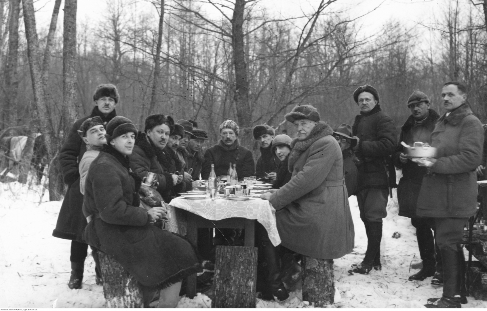 Uczestnicy polowania podczas śniadania w lesie. Widoczni m.in.: prezydent RP Ignacy Mościcki (siedzi pierwszy z prawej), książę Hieronim Radziwiłł (z prawej za prezydentem) księżna Izabela Róza Radziwiłł (z lewej za prezydentem), płk Jan Głogowski (za księżną Radziwiłł), hrabia Benedykt Jan Tyszkiewicz (w środku), adiutant prezydenta kpt. Zygmunt Gużewski, płk Jerzy Wołkowicki, gen. Carton de Viar, hrabia Adam Remigiusz Grocholski (stoi z prawej), hrabia Benedykt Władysław Tyszkiewicz (pierwszy z lewej), hrabia Paweł Potocki (drugi z lewej), książę Karol Mikołaj Radziwiłł (trzeci z lewej) i Michał Mościcki (stoi z lewej).