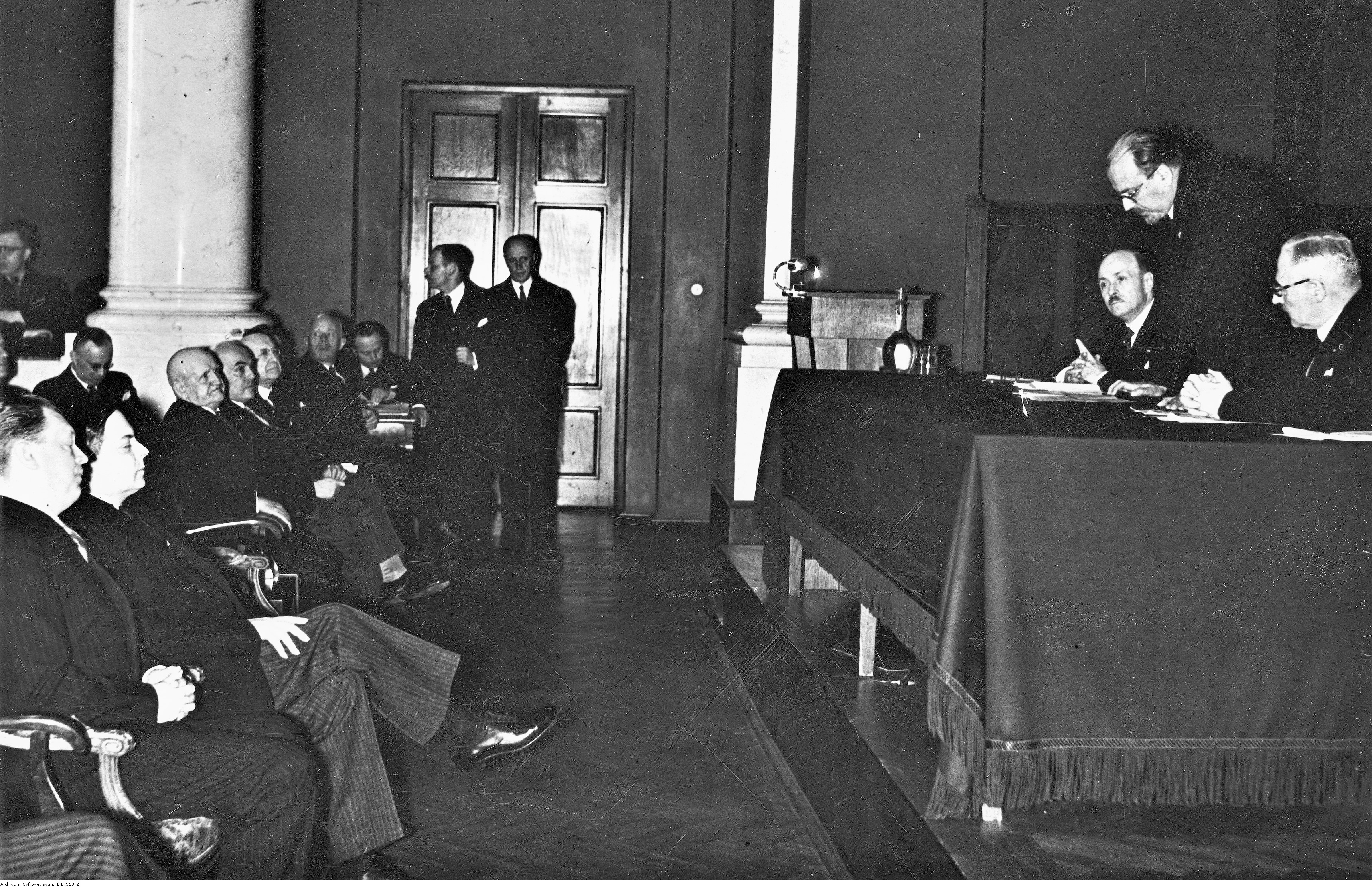 W sali obrad w Pałacu Staszica widoczni m.in.: ambasador Francji w Polsce Leon Noel (I rząd 2. z lewej), prezes paryskiego sądu kasacyjnego Fremicourt (siedzi w prezydium 3. z lewej), marszałek sejmu Wacław Makowski (w prezydium w środku pochylony), profesor Uniwersytetu Jana Kazimierza we Lwowie Roman Longchamps de Berier (siedzi w prezydium 1. z prawej).