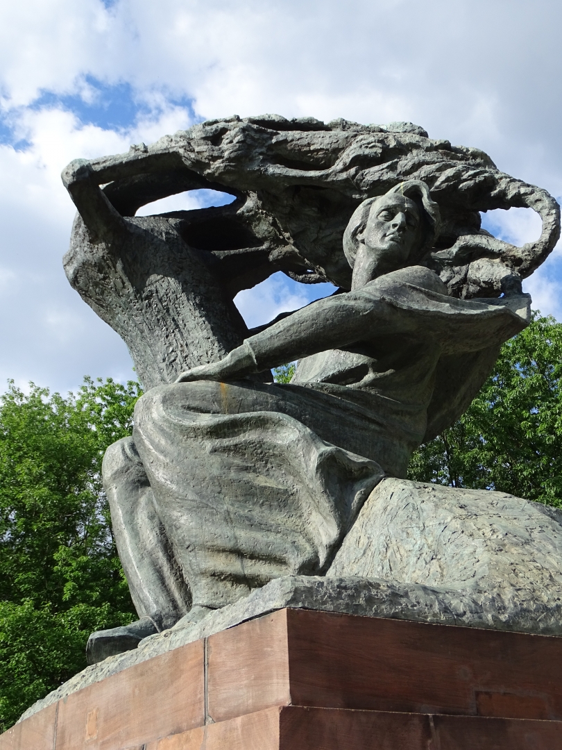 Secesyjny monument przedstawia odlaną w brązie pięciometrową postać kompozytora siedzącą pod stylizowaną wierzbą. Na konkurs rozpisany w 1908 roku wpłynęło 66 prac, z których wybrano projekt rzeźbiarski Wacława Szymanowskiego. Projektu pomnika nie zdążono wykonać do wybuchu I wojny świtowej, ale powrócono do niego po odzyskaniu niepodległości przez Polskę. Wykonany we Francji odlew przewieziono do Warszwy i odsłonięto w listopadzie 1926 roku. W czasie w 1940 na hitlerowscy okupanci wysadzili go, pocięli na części i przetopili. Po wojnie pomnik jednak odtworzono i odsłonięto ponownie w 1958 roku. Układ trawników i alejek wokół pomnika zaprojektował Longin Majdecki. Założenie ogrodowe z posadzonymi amfiteatralnie drzewami przypomina salę koncertową. W okresie letnim w każdą niedzielę pod pomnikiem odbywają się koncerty muzyki Chopina.