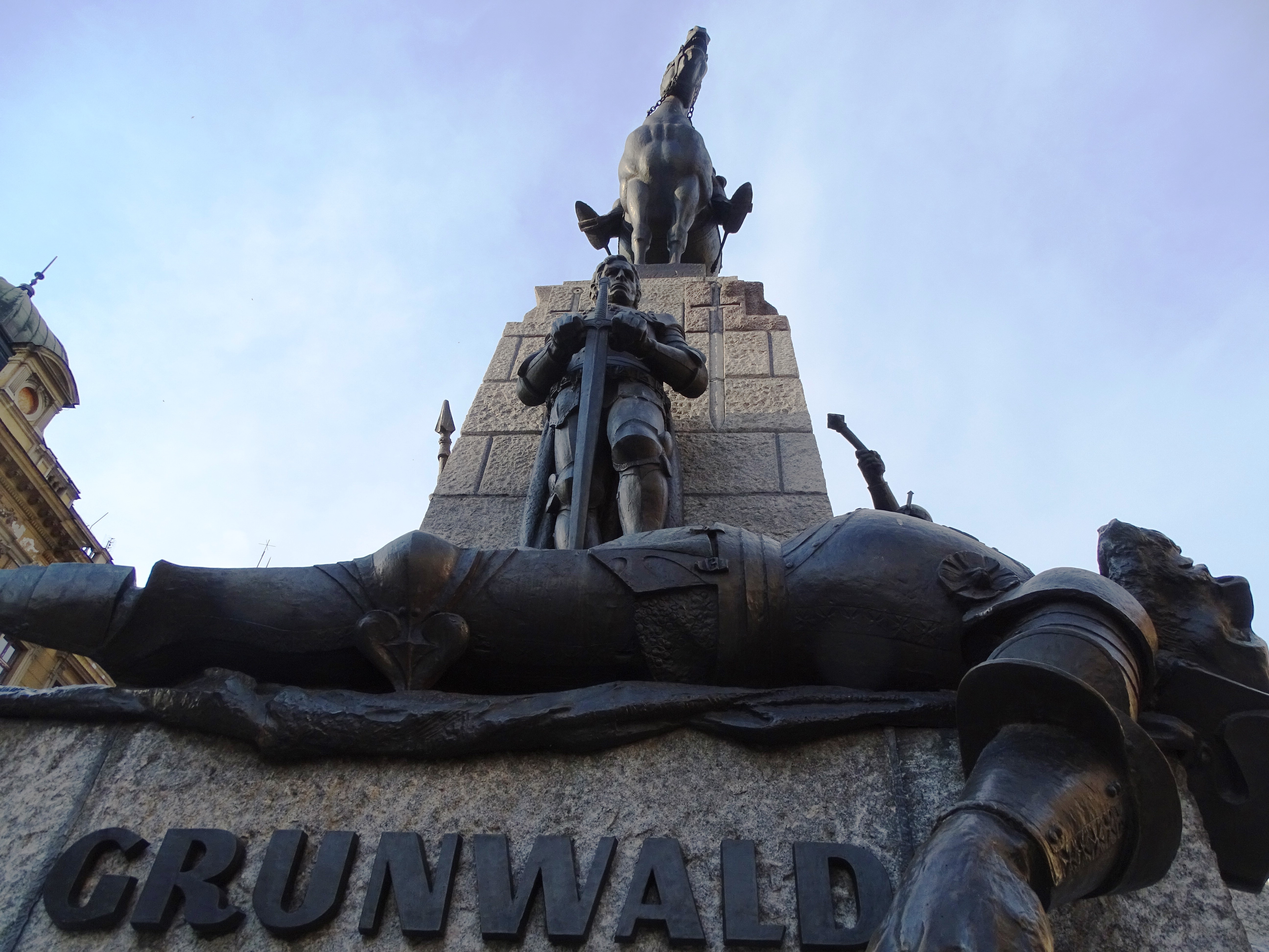Na pierwszym planie widoczne ciało poległego w bitwie pod Grunwaldem wielkiego mistrza zakonu krzyżackiego Ulricha von Jungingena ponad którym stoi wielki książę litewski Witold. Ponad nimi stoi na koniu król Władysław Jagiełło. Pomnik ufundował Igancy Jan Paderewski. Został on odsłonięty w 1910 roku, w 500. rocznicę bitwy pod Grunwaldem. Pomnik został zniszczony przez niemieckich okupantów w 1939 roku, a w 1976 roku zrekonstruowano go według projektu Zygmunta Koniecznego.