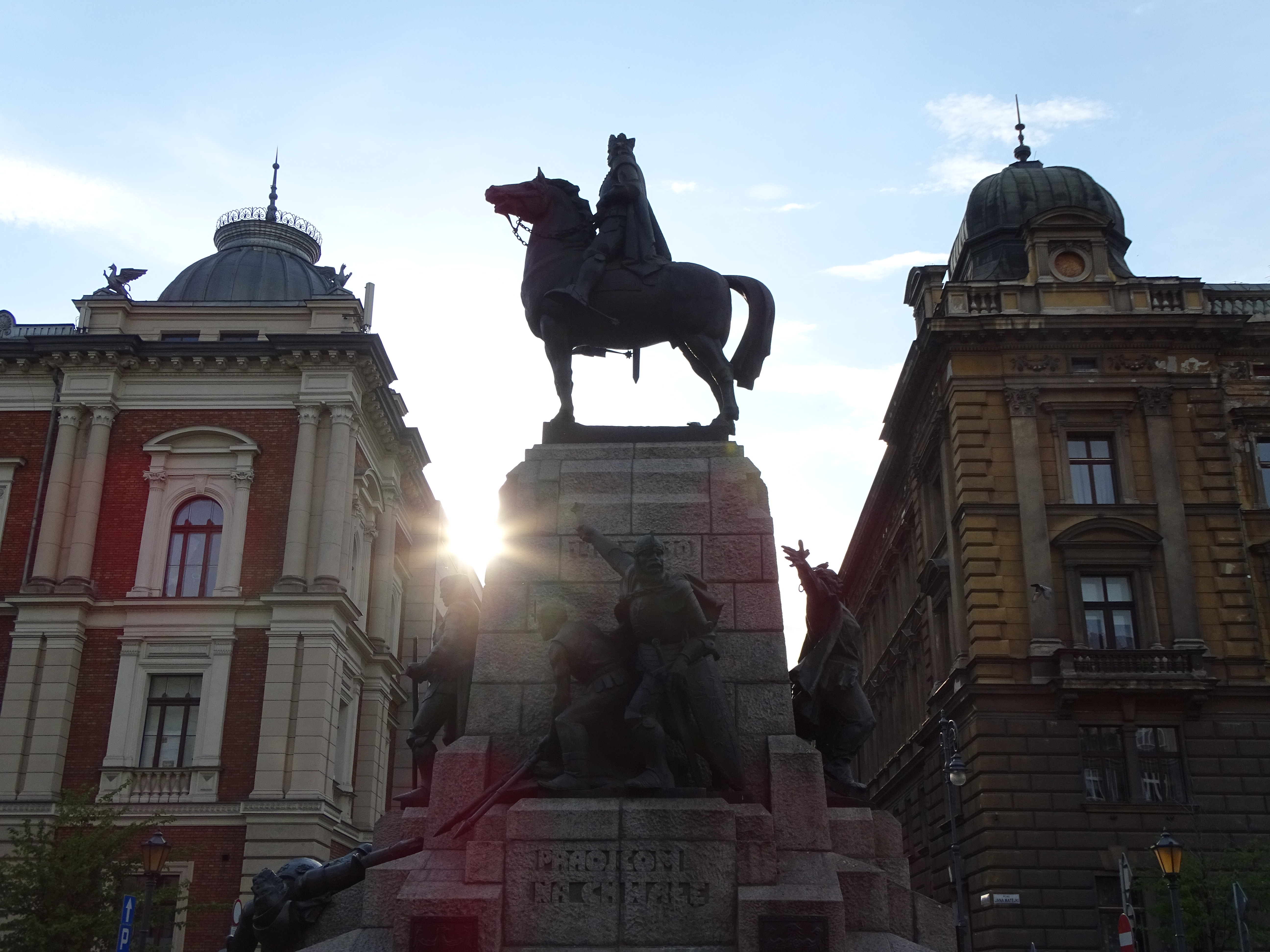 Po wyżej napisu "Praojcom na chwałę" umieszczony został polski rycerz i jego giermek, którzy zbierają krzyżackie chorągwie z pola bitwy. Ponad nimi stoi konny posąg króla Władysława Jagiełły. Pomnik wzniesiony został z fundacji Jana Paderewskiego i odsłonięty w 500. rocznicę bitwy pod Grunwaldem. W czasie hitlerowskiej okupacji został on zniszczony, ale po wojnie zrekonstruowano go według projektu Zygmunta Koniecznego.