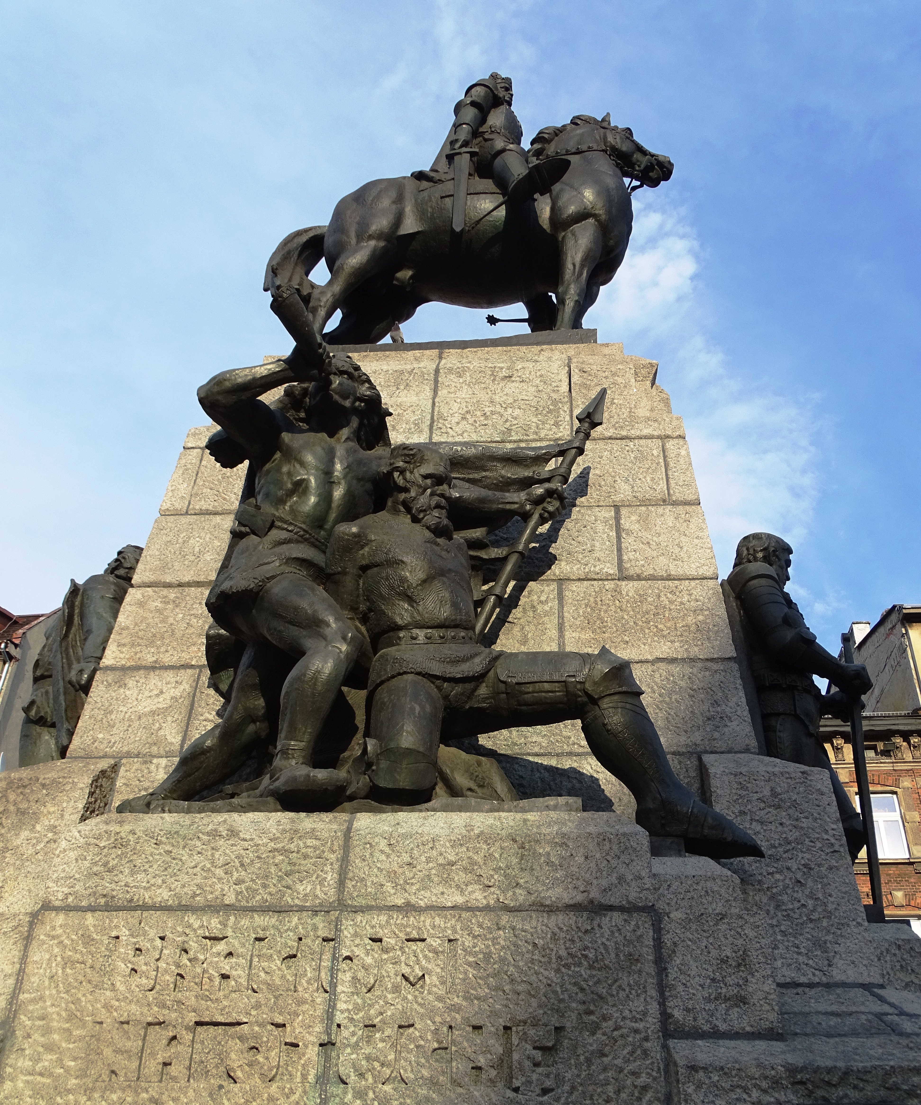 Ponad napisem "Braciom na otuchę", litewski wojownik dmie w róg, prowadząc wziętego do niewoli jeńca krzyżackiego. Powyżej nich stoi posąg konny króla Władysława Jagiełły. Pomnik ufundowany został przez Ignacego Jana Paderewskiego i odsłonięty w 1910 roku, w 500. rocznicę bitwy pod Grunwaldem. Po całkowitym zniszczeniu przez niemieckich okupantów został on został on zrekonstruowany według projektu Zygmunta Koniecznego.