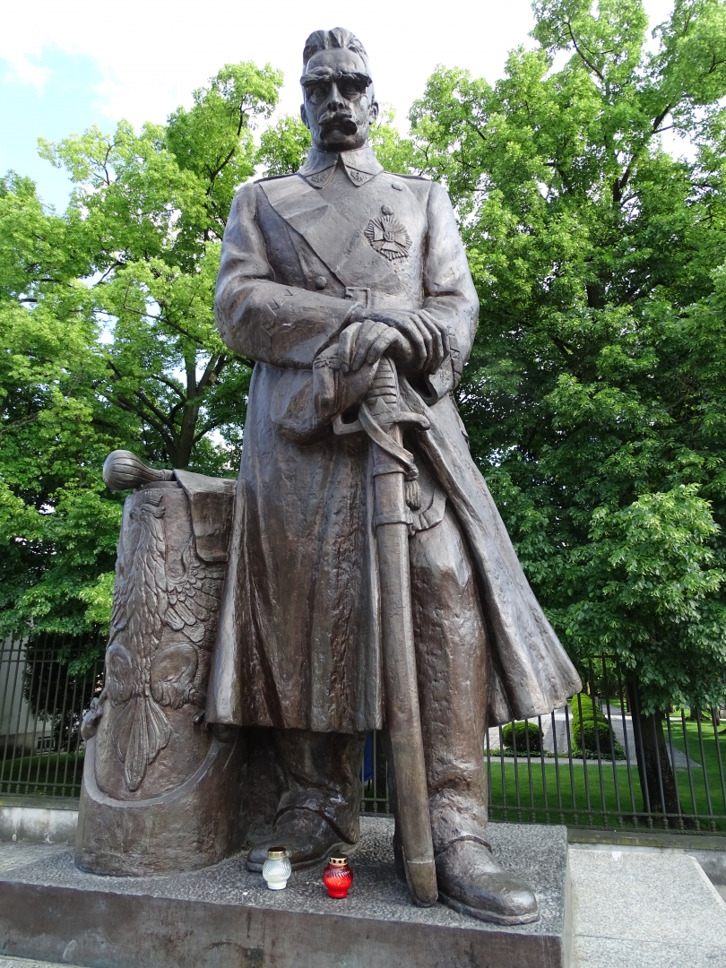 Posąg przedstawia Marszałka w pozycji stojącej opierającego się o szablę. Pierwowzorem pomnika była marmurowa rzeźba Józefa Piłsudskiego wykonana przez Stanisława Ostrowskiego przed II wojną światową. Pomnik ten, przechowany w Starej Pomarańczarni w Łazienkach Królewskich, stał się podstawą do odlewu ze spiżu, wykonanego m.in. dzięki inicjatywie Ministerstwa Obrony Narodowej, które przekazało na ten cel łuski armatnie.