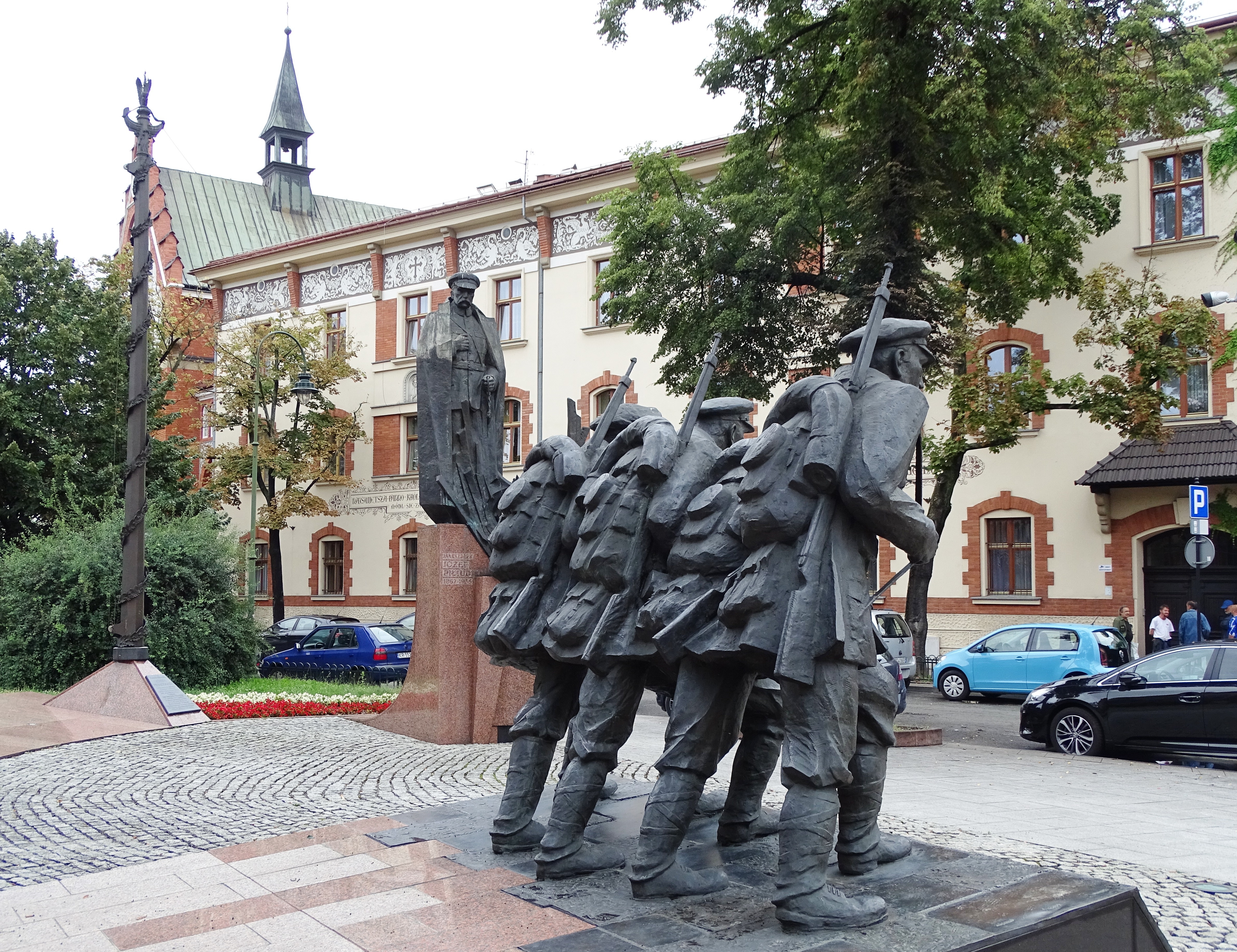 Monument przy ulicy Piłsudskiego autorstwa Czesława Dźwigaja odsłonięto z okazji 90. rocznicy niepodległości 10 listopada 2008 r. Pomnik składa się z posągu Piłsudskiego, Czwórki Legionowej i masztu flagowego. Figura Marszałka ustawiona została na na wysokim marmurowym cokole. Przed Marszałkiem znajduje się rzeźba przedstawiająca Czwórkę Legionową, wyruszającą w 1914 roku na bojowy szlak z krakowskich Oleandrów. Za figurą Piłsudskiego wznosi się ponad 8-metrowy maszt, opleciony wieńcem laurowym z różami. Zwieńczenie masztu ma kształt główki laski marszałkowskiej z okresu II Rzeczypospolitej.