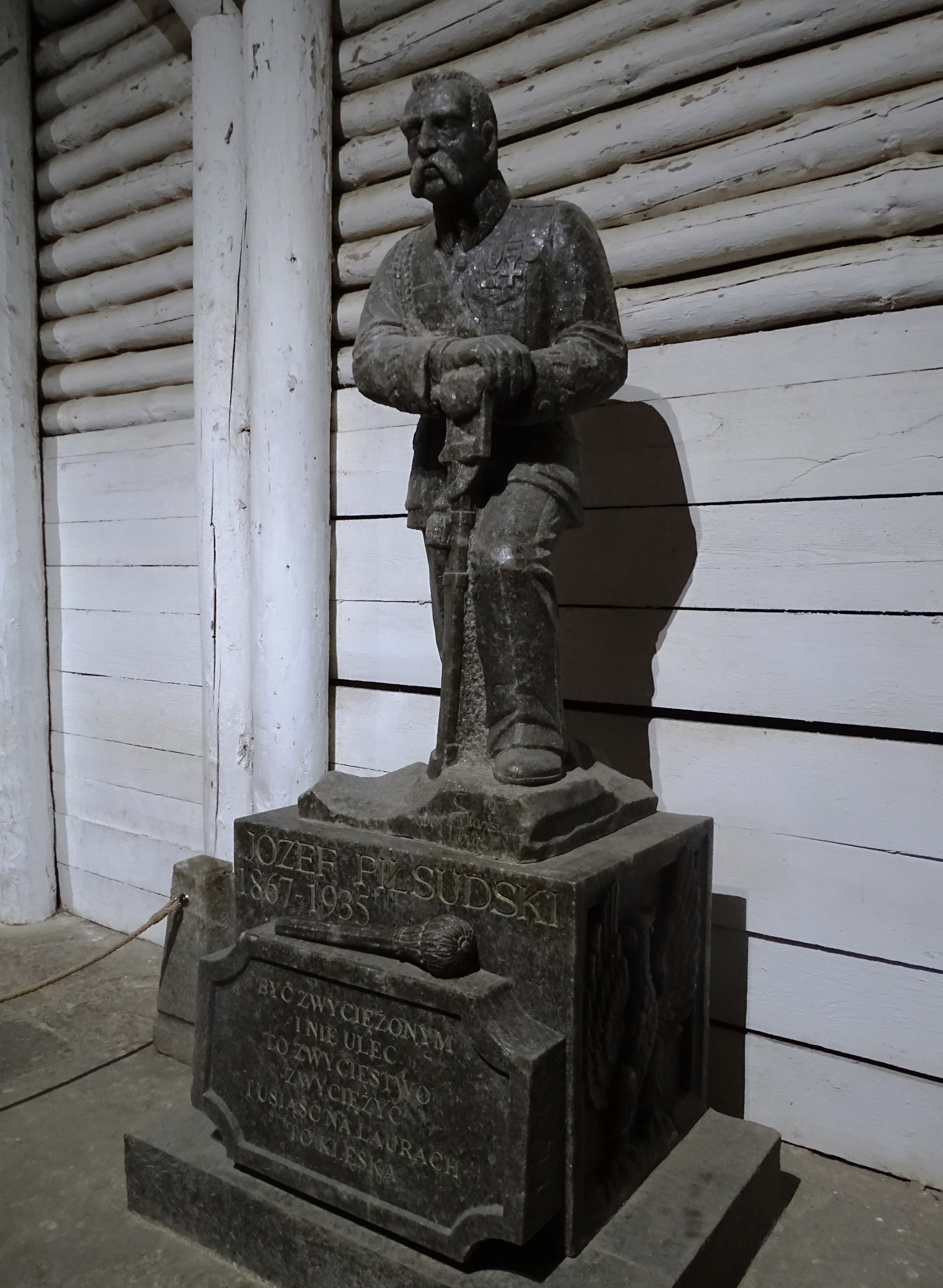 Autorem wykutej w soli rzeźby jest górnik Stanisław Anioł, który stworzył wiele innych solnych dzieł, które można podziwiać w podziemiach kopalni. Pomnik przedstawia marszałka w uroczystym stroju wojskowym wspartego na broni, będącej symbolem jego walki o niepodległość. Rzeźba umieszczona jest na cokole, na którym widać buławę i cytat: „Być zwyciężonym i nie ulec to zwycięstwo. Zwyciężyć i spocząć na laurach to klęska”. Nie jest to jedyne upamiętnienie Marszałka w wielkiej kopalni. Jego imieniem nazwano także po odzyskaniu niepodległości w 1918 roku jedną z podziemnych komór. Józef Piłsudski odwiedził osobiście wielicką kopalnię 20 października 1919 roku, przy okazji wizyty na południu kraju w związku z udziałem w uroczystościach otwarcia Akademii Górniczo-Hutniczej w Krakowie.