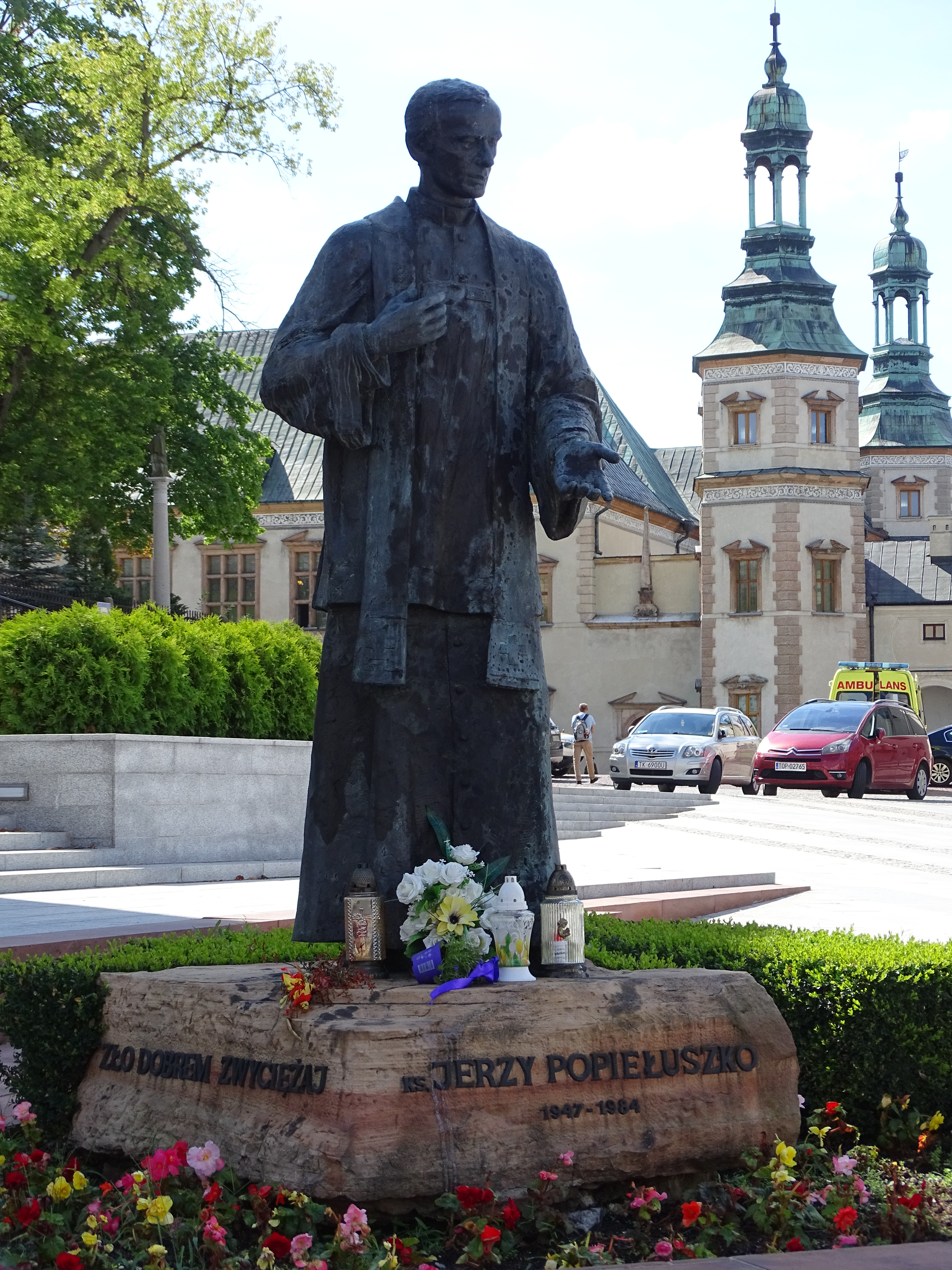 Monument autorstwa Grzegorza Łagowskiego odsłonięto 20 października 1999 roku w 15. rocznicę śmierci księdza Jerzego.. Wykonana z brązu rzeźba została umieszczona na kamiennym cokole z napisem: "Zło dobrem zwyciężaj".
