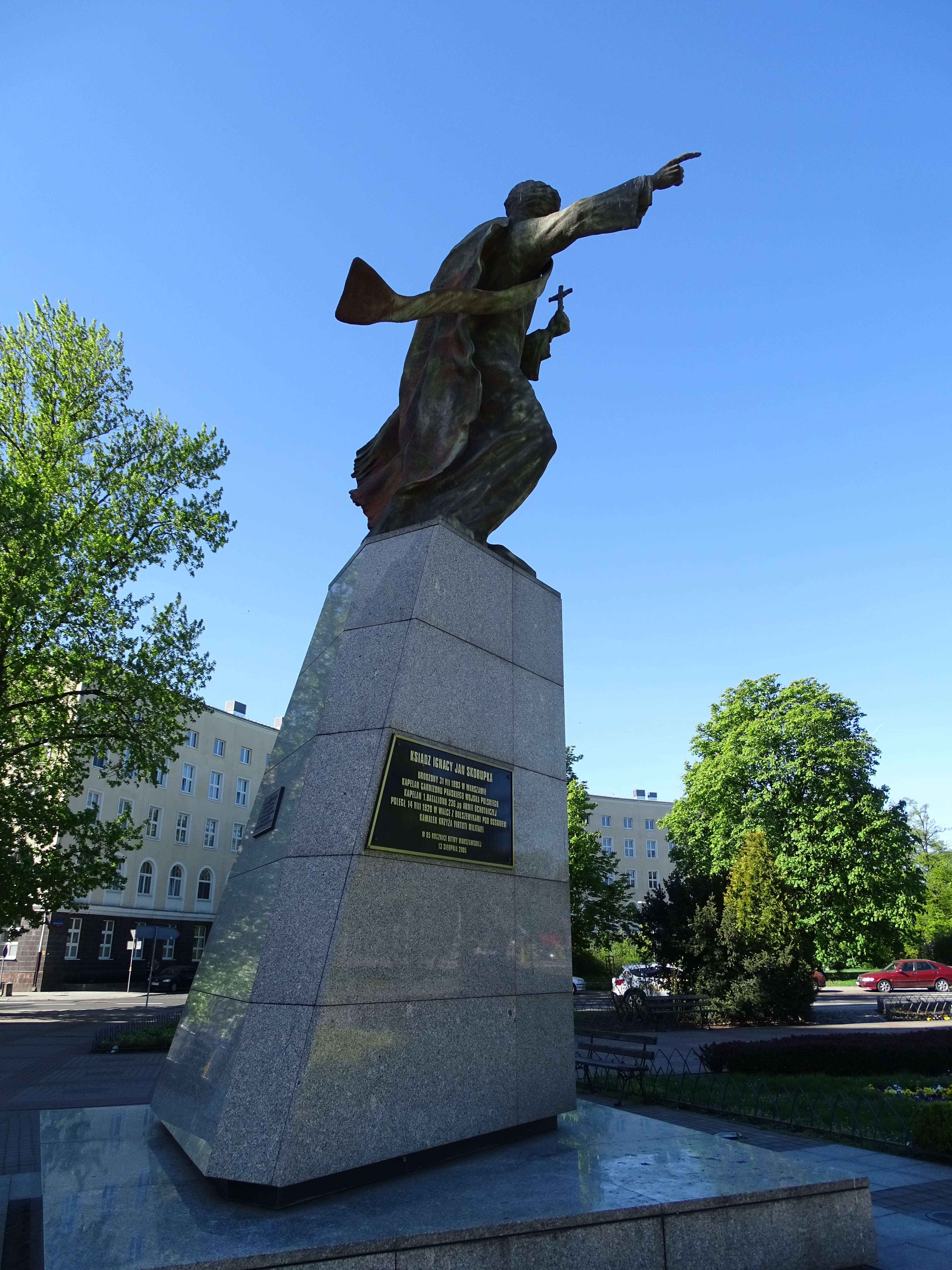 Spiżowa rzeźba ma 4 metry wysokości, a całość pomnika wraz z granitowym cokołem 9 metrów. Napis na cokole głosi: "Ksiądz Ignacy Jan Skorupka urodzony 31 VII 1893 w Warszawie. Kapelan Garnizonu Praskiego Wojska Polskiego. Kapelan I Batalionu 236 pp. Armii Ochotniczej. 14 sierpnia 1920 poległ w walce z bolszewikami pod Ossowem. Kawaler Krzyża Virtuti Militari. Pochowany na Cmentarzu Wojskowym na Powązkach. 13 sierpnia 2005 w 85 rocznicę Bitwy Warszawskiej." (data w ostatnim zdaniu to dzień odsłonięcia pomnika)