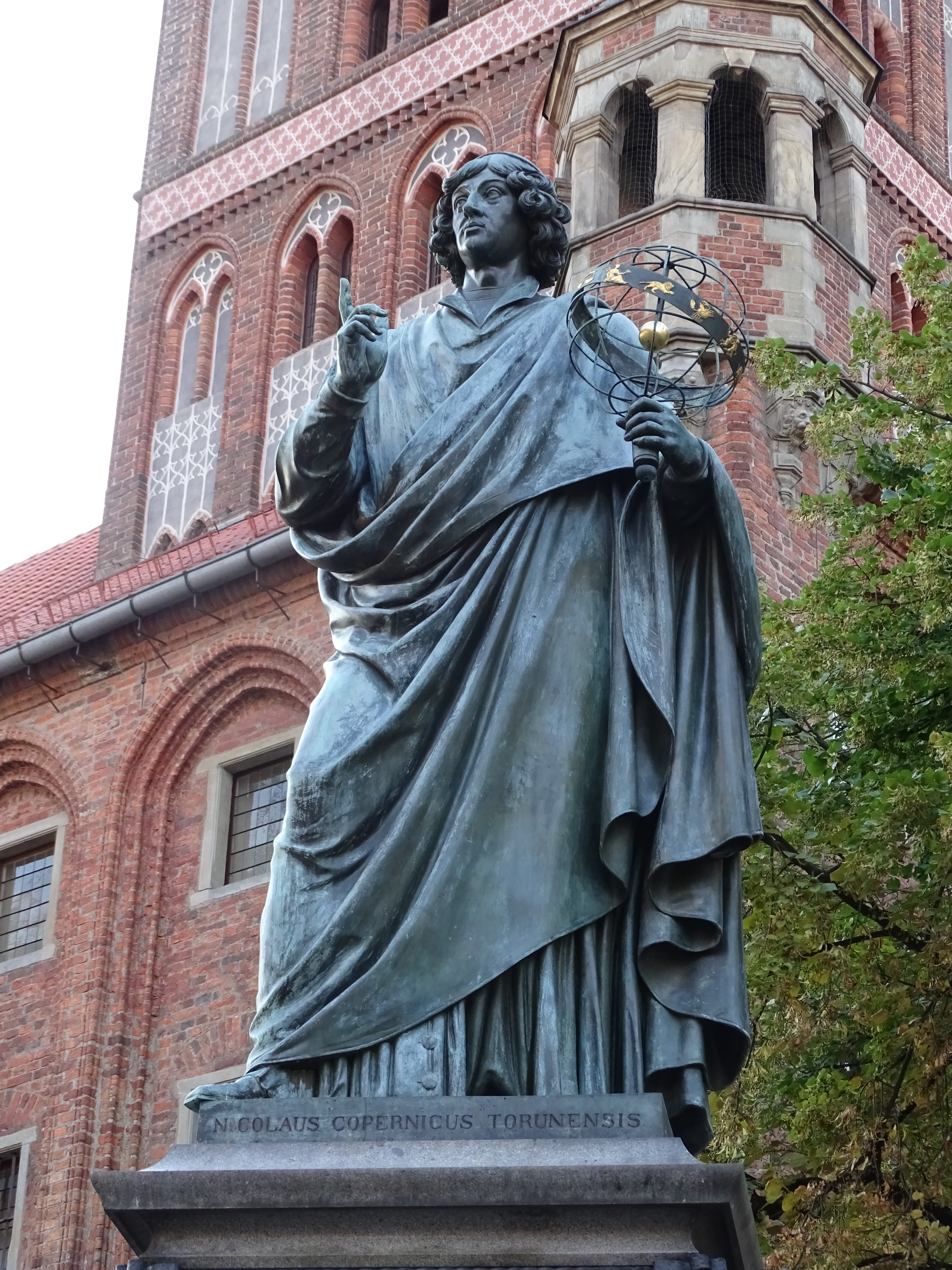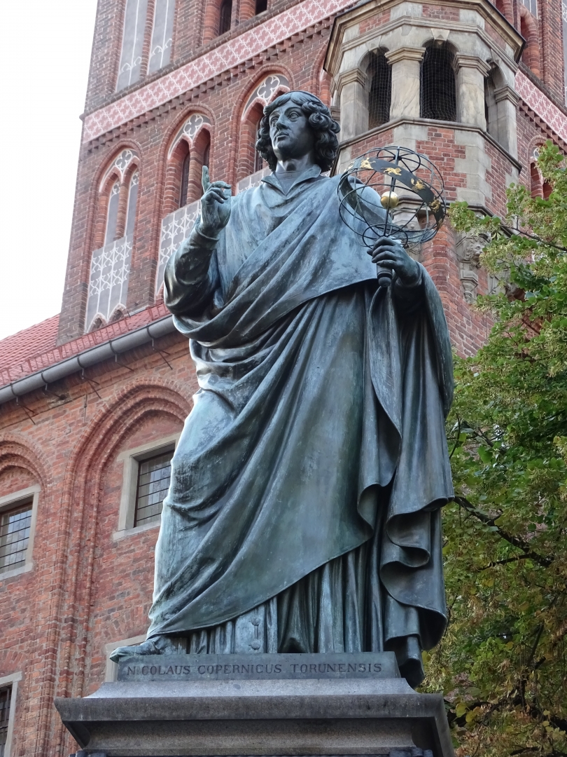 Monument przedstawia astronoma w todze profesorskiej, który trzyma w lewej ręce astrolabium (przyrząd astronomiczny będący modelem sfery niebieskiej), a palcem prawej ręki wskazuje niebo. Napis w języku łacińskim umieszczony na cokole pomnika brzmi „Nicolaus Copernicus Thorunensis. Terrae motor, Solis Caelique stator” (czyli "Mikołaj Kopernik Torunianin. Ruszył Ziemię, wstrzymał Słońce i Niebo").