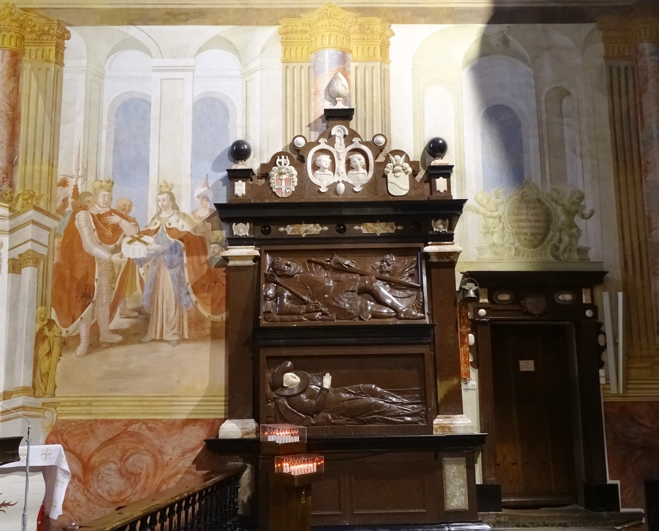 Kaplica zwana obecnie Kaplicą Relikwi Krzyża Świętego, wybudowana została w latach 16111620 z funduszy kasztelana Mikołaja Oleśnickiego i służyła początkowo jako grobowiec rodziny, w którym pochowano m.in. fundatora i jego małżonkę Zofię. W 1723 roku przeniesiono do tej kaplicy relikwie Krzyża Świętego, które są obecnie przechowywane w tabernakulum.  Manierystyczy piętrowy pomnik nagrobny fundatorów znajduje się na południowej ścianie kaplicy.    Na ścianie widoczny jest jeden z cyklu fresków  Macieja Reichmana z 1782 roku przedstawiających Historię Drzewa Krzyża Świętego (Św. Helena daje cząstkę Krzyża swemu synowi Konstantynowi).