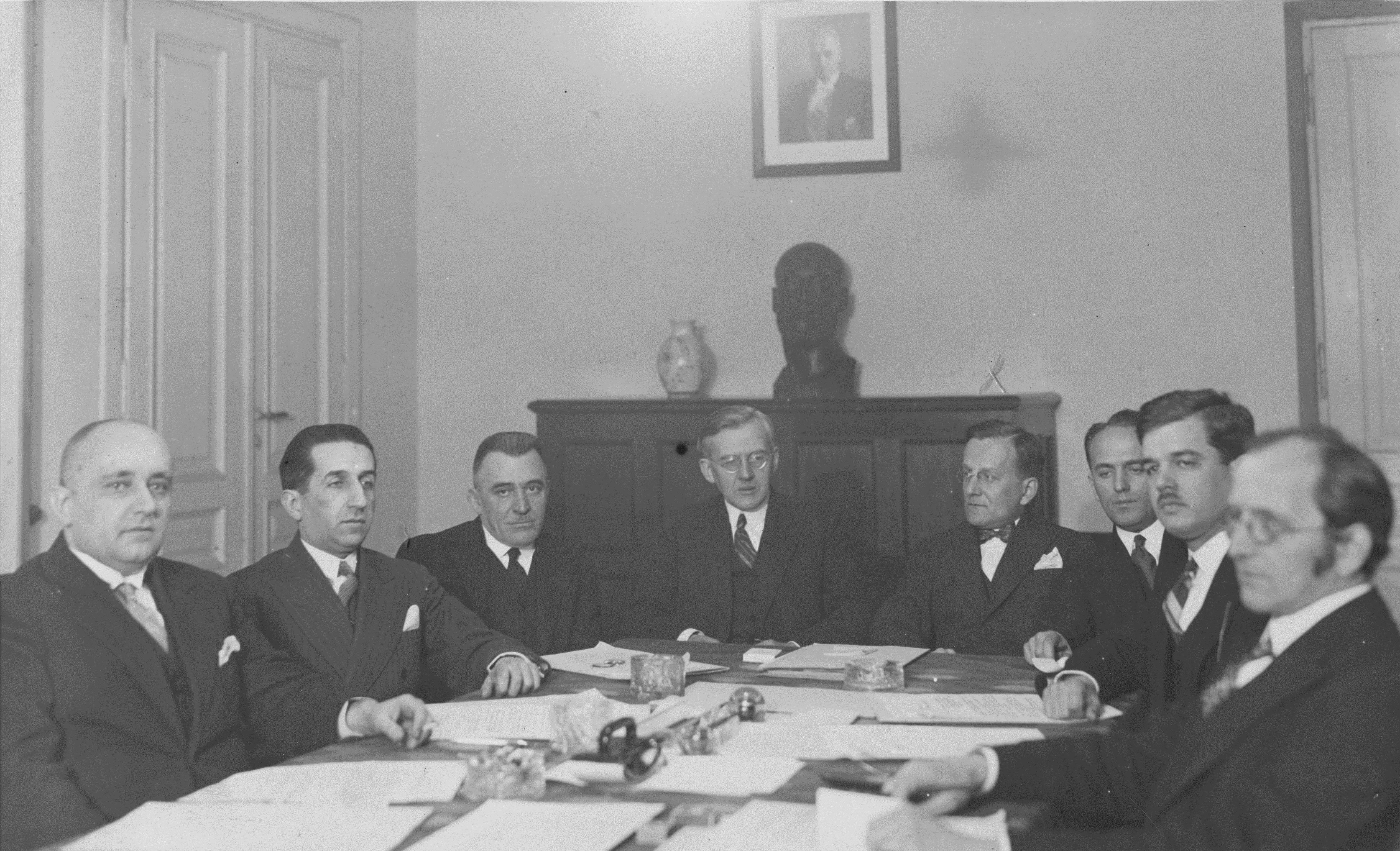 Członkowie jury. Siedzą od lewej: recenzent muzyczny Władysław Fabry, pianista Zbigniew Drzewiecki, kompozytor Tadeusz Czerniawski, przewodniczący jury muzykolog Adolf Chybiński, delegat Departamentu Sztuki Ministerstwa Wyznań Religijnych i Oświecenia Publicznego Janusz Miketta, redaktor Mateusz Gliński, dyrygent Teodor Zalewski i kompozytor Łucjan Kamieński. (Państwową nagrodę muzyczną za rok 1930 w wysokości 15 000 zł. otrzymał kompozytor Ludomir Różycki za operę "Eros i Psyche").