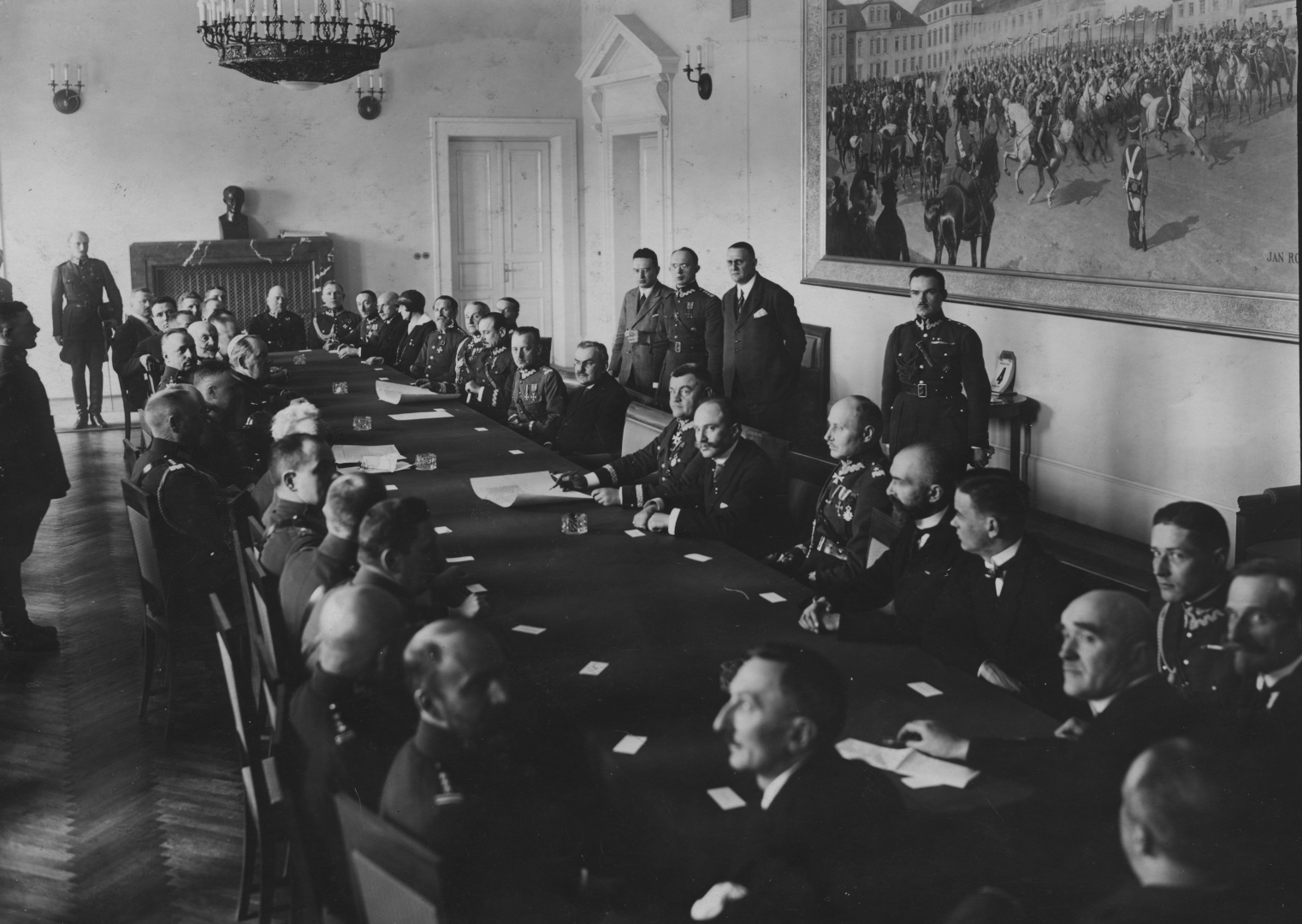 Widok na salę konferencyjną podczas posiedzenia. Widoczni m.in.: prezes Związku Legionistów Polskich Walery Sławek, generał Władysław Sikorski, premier Władysław Grabski, gen. Józef Haller, gen. Tadeusz Jordan Rozwadowski, gen. Daniel Konarzewski, gen. Kazimierz Sosnkowski, biskup polowy WP Stanisław Gall.