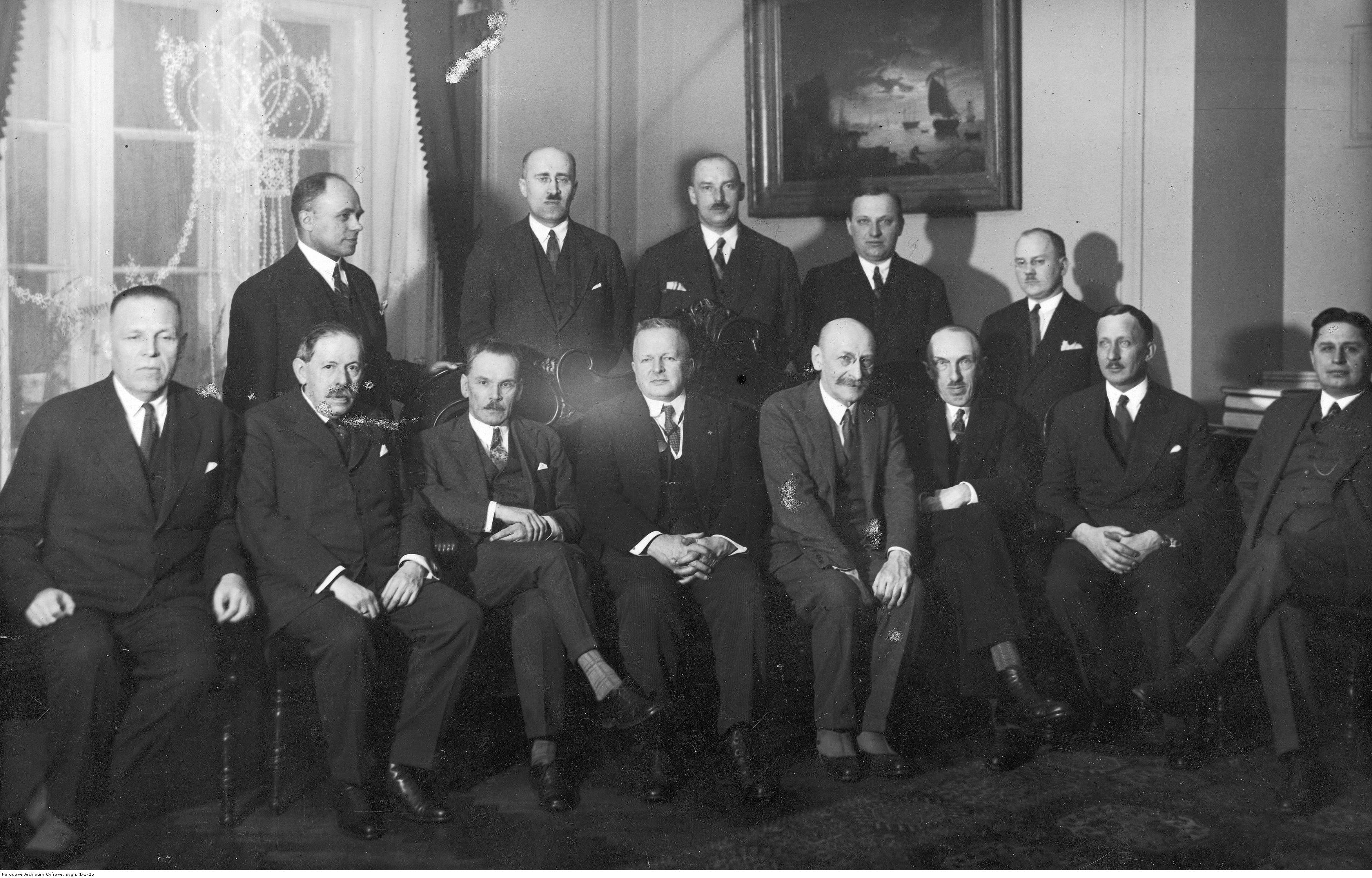 Siedzą od prawej: delegat Rządu do Rady Administracyjnej Międzynarodowego Biura Pracy w Genewie Stanisław Jurkiewicz, wiceprezes Banku Gospodarstwa Krajowego Feliks Maciszewski, prezes Banku Rolnego Seweryn Ludkiewicz, senator Marcin Szarski, marszałek senatu Julian Szymański, prezes Banku Polskiego Władysław Wróblewski, dyrektor Banku Dyskontowego Paweł Heilperin, NN. Stoją m.in.: dyr. Michał Pankiewicz (1. z lewej), dyr. Urzędu Emigracyjnego Bolesław Nakoniecznikoff (3. z lewej), dyr. Stanisław Pawłowicz (4. lewej).