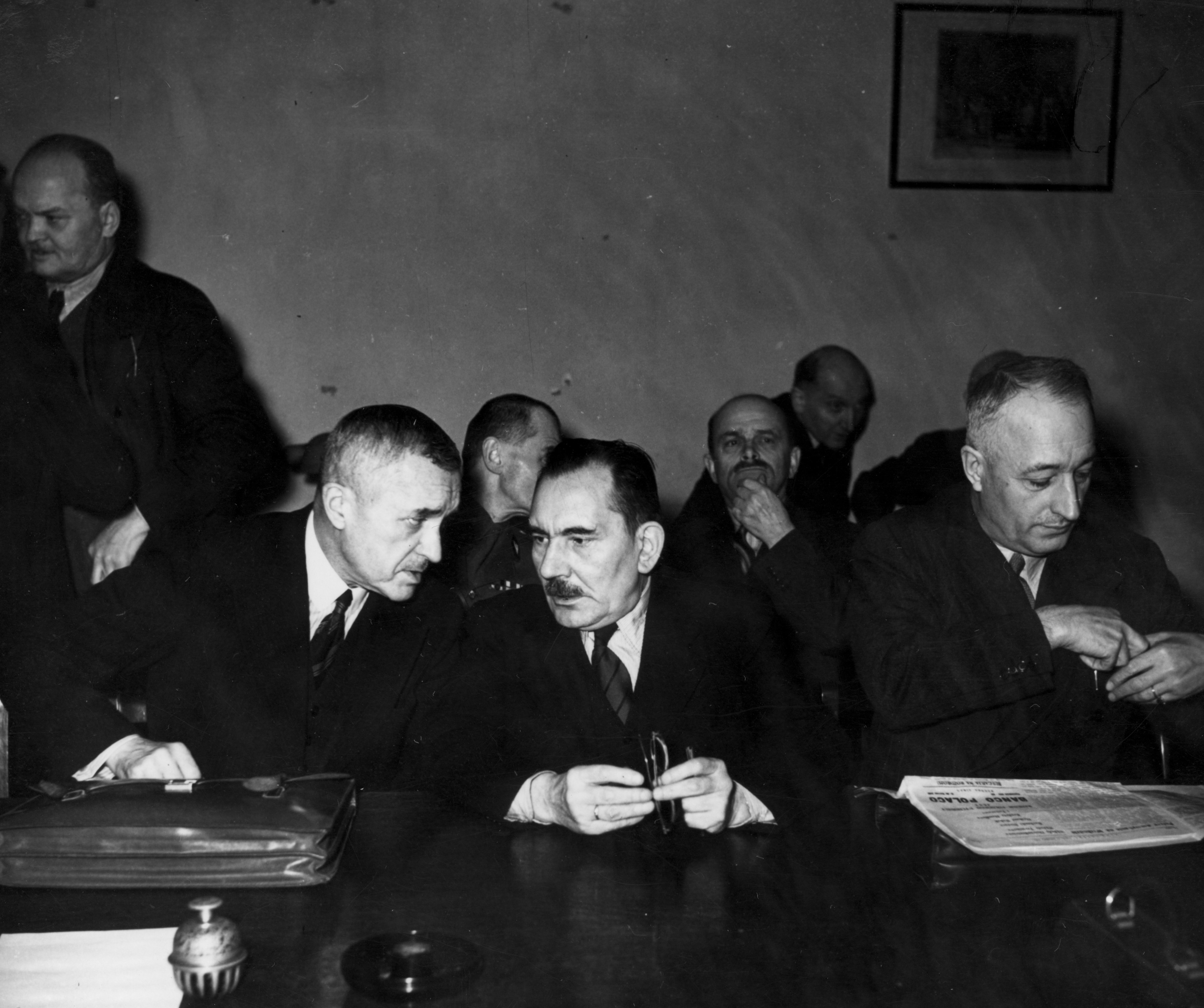 Posiedzenie Rady Narodowej z udziałem premiera Stanisława Mikołajczyka 18.01.1944 roku w Londynie. share Podziel się facebook google + twitter linkedin clipboard envelope print quote picture add × Cytowane źródła Cytowanie źródła on-line, czyli Internetowego Polskiego Słownika Biograficznego Posiedzenie Rady Narodowej z udziałem premiera Stanisława Mikołajczyka 18.01.1944 roku w Londynie., [online] Warszawa: Narodowy Instytut Audiowizualny [dostęp 27.02.2026]. Dostępny w internecie: http://www.biogramy.pl/a/foto/posiedzenie-rady-narodowej-z-udzialem-premiera-stanislawa-mikolajczyka-18011944-roku-w-londynie Cytowanie wydania drukowanego, czyli Polskiego Słownika Biograficznego , Posiedzenie Rady Narodowej z udziałem premiera Stanisława Mikołajczyka 18.01.1944 roku w Londynie., [w:] Polski słownik biograficzny, t. , IPSBID: ipsb-fo-74652 × Wyślij link do strony E-mail odbiorcy wiadomości: To pole jest wymaganeWpisz poprawny adres e-mail Twój adres e-mail: To pole jest wymaganeWpisz poprawny adres e-mail Podgląd wiadomości, która zostanie wysłana: Witaj, [Tutaj podany Twój e-mail] poleca Ci treść z iPSB (internetowym Polskim Słowniku Biograficznym) Posiedzenie Rady Narodowej z udziałem premiera Stanisława Mikołajczyka 18.01.1944 roku w Londynie. × Dodaj do kolekcji wybierz kolekcję, do której chcesz dodać ten artykuł: lub wpisz nazwę nowej kolekcji, do której chcesz dodać ten artykuł: : To pole jest wymagane Dodaj do kolekcji Wybierz kolekcję Swoje kolekcje znajdziesz w profilu. Wystarczy kliknąć ikonę zębatego koła w górnym prawym rogu. Możesz je zobaczyć tu: moje kolekcje. × Dodaj do kolekcji Element został dodany do Twojej kolekcji. Swoje kolekcje możesz zobaczyć tu: moje kolekcje. × Dodaj do kolekcji Aby dodawać materiały do kolekcji musisz się zalogować. OPIS POSTACI POWIąZANE Na pierwszym planie siedzą od lewej: minister Marian Seyda, minister Jan Stańczyk, minister Karol Popiel. Fotografię wykonał Czesław Datka. Postaci powiązane Karol Popiel 1887-10-28 - 1977-06-06 działacz polityczny Marian Seyda 1879-07-07 - 1967-05-17 polityk endecki Jan Stańczyk 1886-12-23 - 1953-08-07 działacz socjalistyczny więcej >> Zobacz zdjęcie w najwyższej jakości Źródło