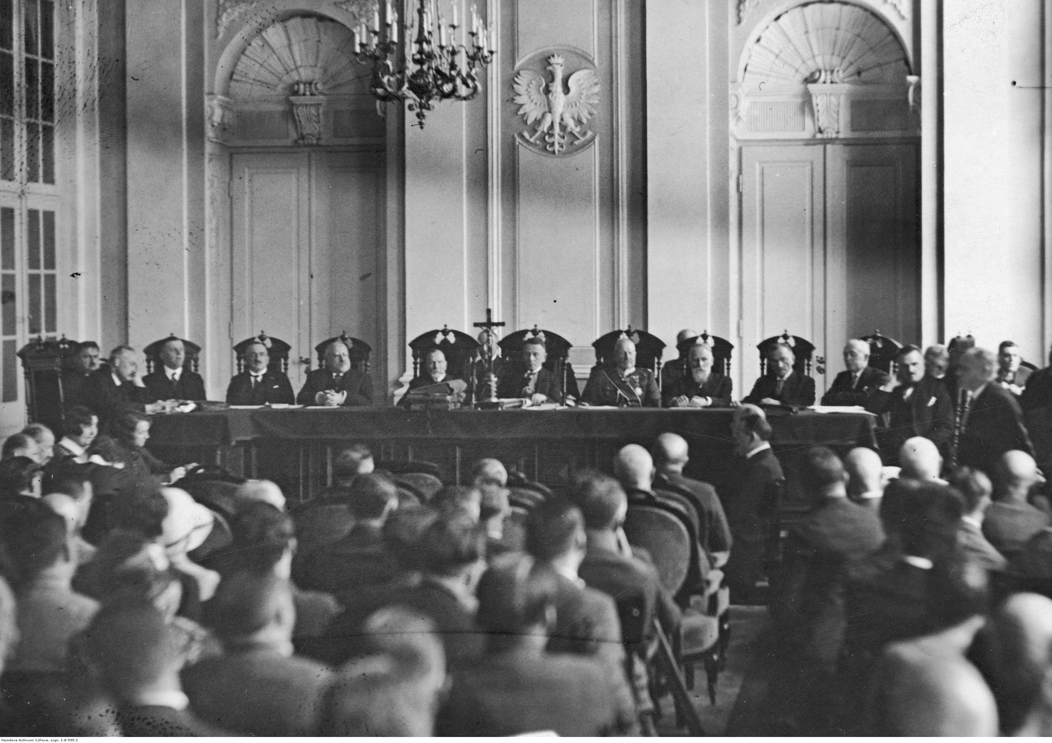 Za stołem widoczni siedzą od lewej: Tadeusz Tomaszewski, Antoni Zubowicz, Oleśnicki, Aleksander Raczyński, Adolf Suligowski, Leon Supiński, generał broni Lucjan Żeligowski, Józef Beck, Stanisław Thugutt, Antoni Bogucki, Wacław Szumański. Przemawia obrońca Gabriela Czechowicza Franciszek Paschalski.