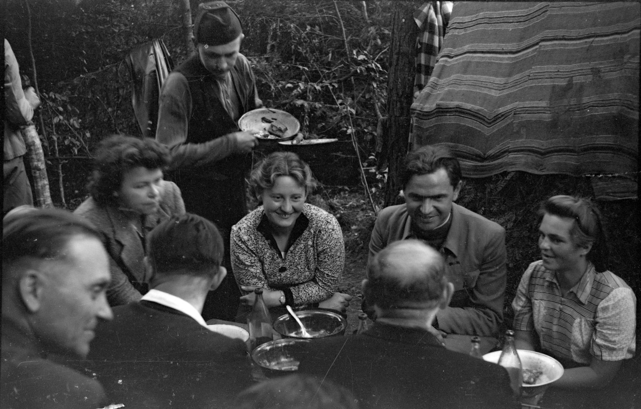 Za stołem od prawej: „Jutrzenka” Czesława Białek, por. „Ponury” Jan Piwnik, „Marta” Maria Starosz, stoi podoficer prowiantowy „Pik” NN, „Ewa” Janina Głowicka, na pierwszym planie widoczny z prawego profilu ppor. „Albiński” Hipolit Krogulec, tyłem por. „Nurt” Eugeniusz G. Kaszyński, ks. „Robak” Marian Majewski.