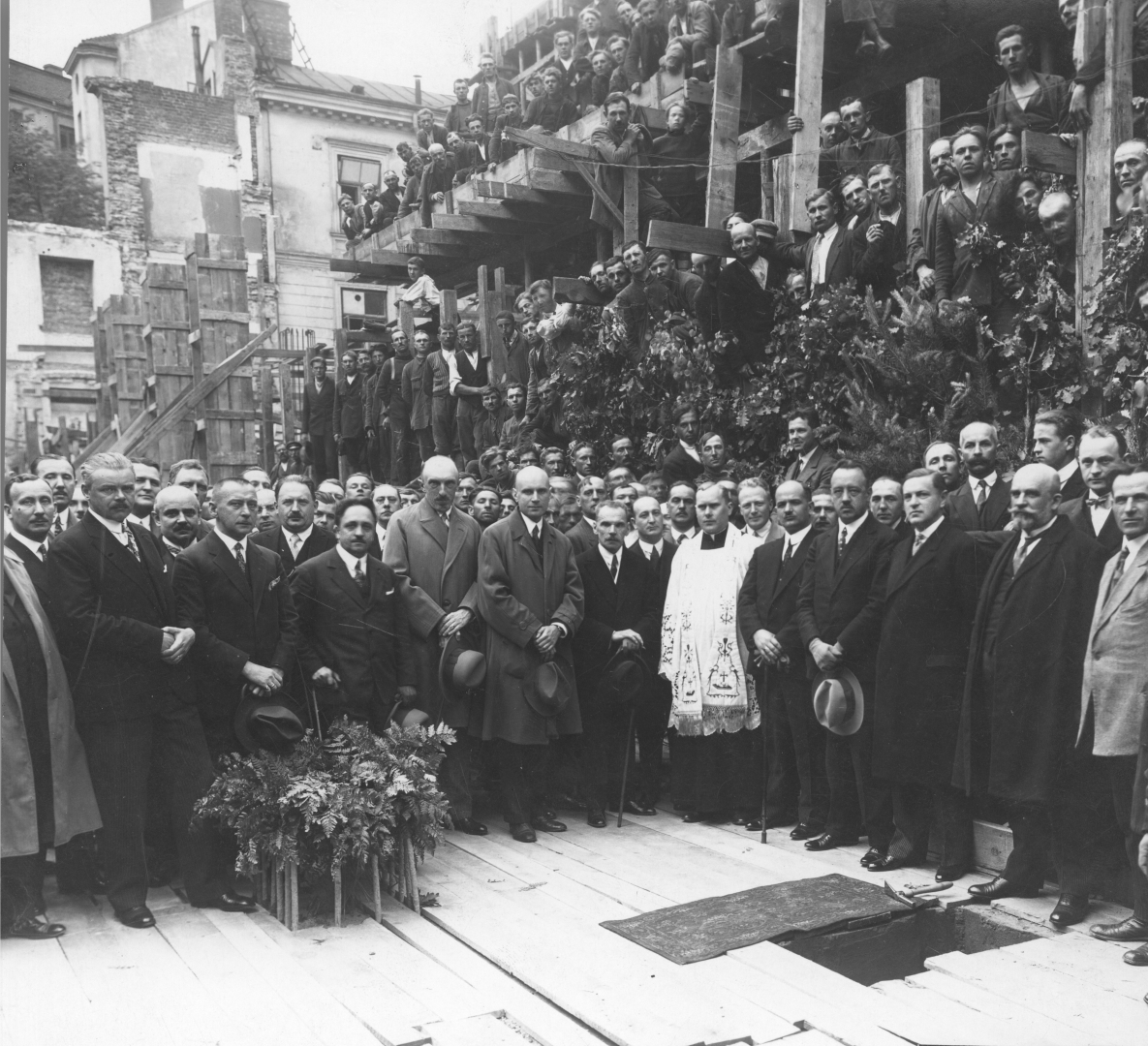 Wśród uczestników uroczytsości widoczni m.in.: prezes Banku Gospodarstwa Krajowego (1. rząd, piąty z prawej), prezydent m.st. Warszawy Zygmunt Słomiński (I rząd, czwarty z prawej), dyrektor Departamentu Obrotu Pieniężnego Ministerstwa Skarbu Leon Barański (1. rząd, piąty z lewej).