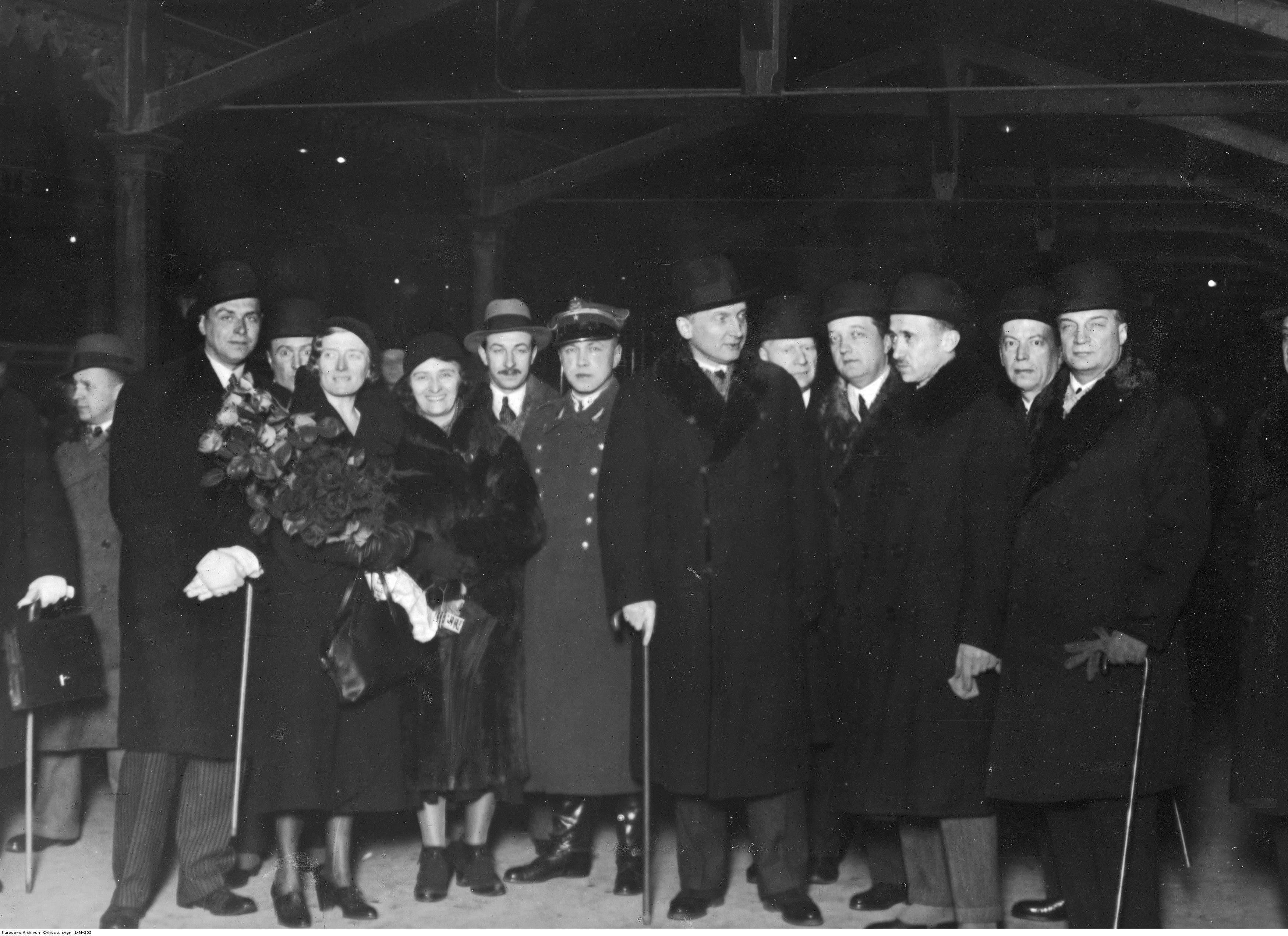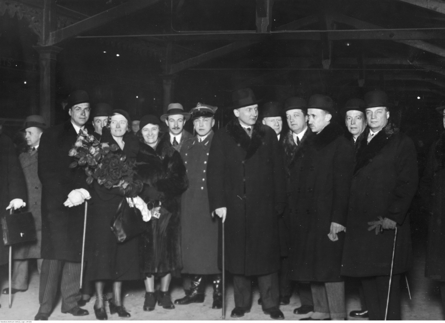 Powitanie delegacji na Dworcu Głównym. Widoczni od lewej: sekretarz ministra Zaleskiego Wacław Zyndram Kościałkowski, żona ministra Zaleskiego Ewelina, poetka Kazimiera Iłłakowiczówna, sekretarz ministra Zaleskiego Czerwiński, naczelnik Wydziału Administracyjno-Gospodarczego MSZ mjr Stanisław Próchnicki, minister spraw zagranicznych August Zaleski, zastępca naczelnika Wydziału Zachodniego MSZ Włodziemierz Adamkiewicz, naczelnik Wydziału Wschodniego MSZ Tadeusz Schaetzel, dyrektor Protokołu Dyplomatycznego MSZ Karol Romer; w głębi naczelnik Wydziału Zachodniego MSZ Józef Lipski (pomiędzy Zaleskim a Schaetzlem).
