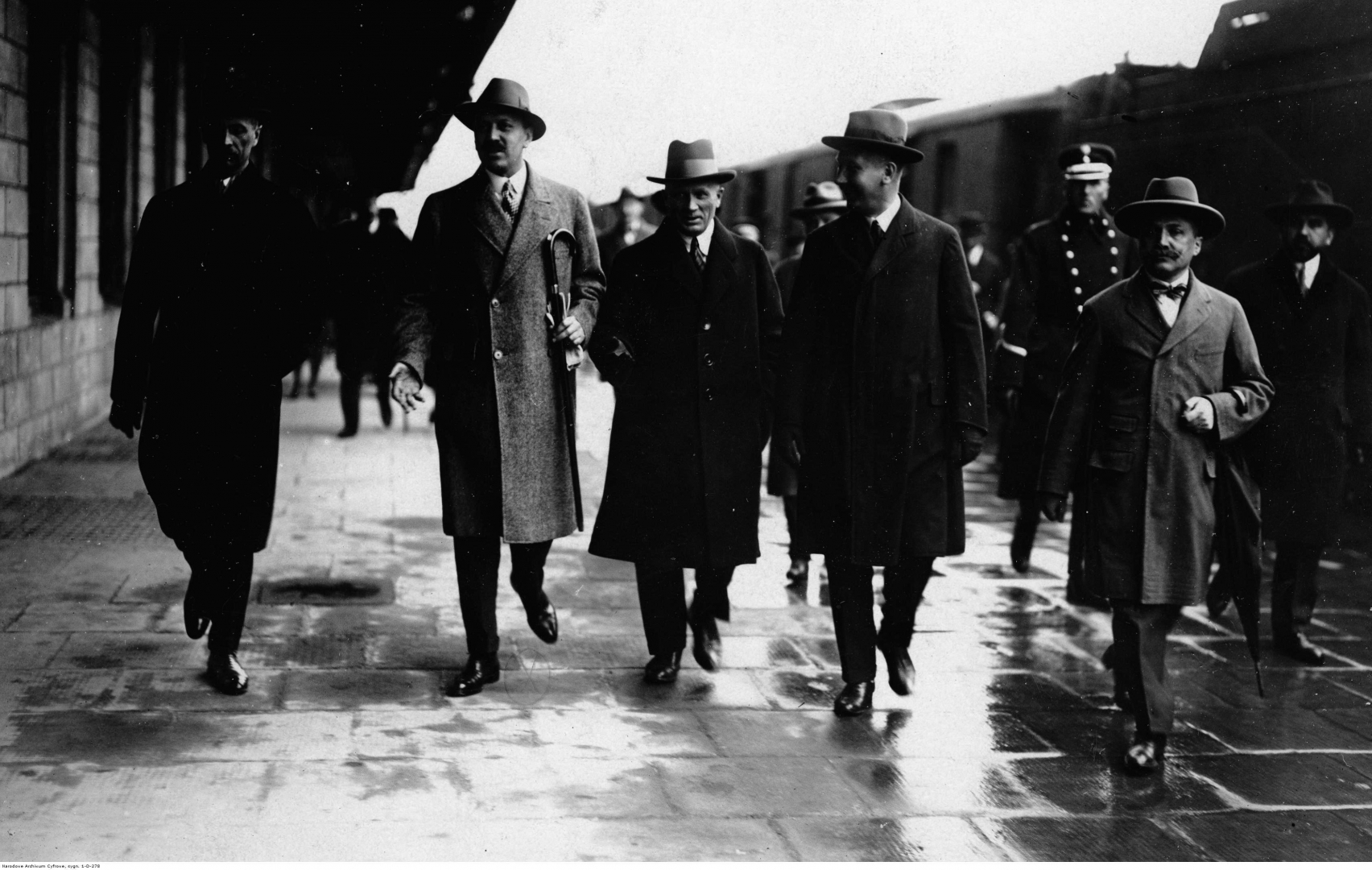Premier i minister spraw zagranicznych Polski Aleksander Skrzyński (drugi z lewej) w towarzystwie polskich polityków na peronie Dworca Wileńskiego w Warszawie. Widoczni m.in.: minister spraw wewnętrznych Władysław Raczkiewicz (pierwszy z lewej), minister przemysłu i handlu Stanisław Osiecki, minister pracy i opieki społecznej Bronisław Ziemięcki i minister komunikacji Adam Chądzyński.