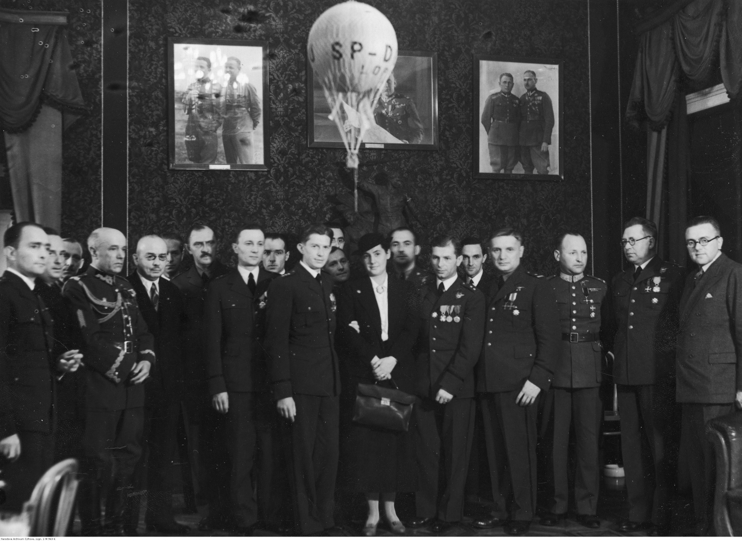 Załoga balonu "LOPP" kapitan Antoni Janusz (stoi na lewo od kobiety) i porucznik Stanisław Brenk (stoi na prawo od kobiety) na spotkaniu w Zarządzie Głównym LOPP. Widoczni m.in.: prezes Zarządu Głównego Ligi Obrony Powietrznej i Przeciwgazowej generał Leon Berbecki (I rząd 2. z lewej), sekretarz Zarządu Głównego LOPP major Adam Wojtyga (I rząd 3. z prawej), major Stanisław Mazurek (I rząd 4. z prawej), pułkownik Jan Wolszlegier (stoi pod zdjęciem wiszącym na ścianie z lewej strony z wąsami), wiceprezes Rady Głównej LOPP Maksymilian Huber (stoi na prawo od L. Berbeckiego).