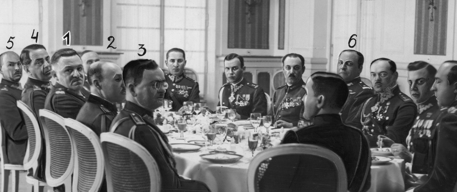 Uczestnicy śniadania pożegnalnego wydanego przez gen. Tadeusz Piskora. Przy stole widoczni: gen. Tadeusz Piskor (trzeci po lewej), płk Aurel Nicolaescu (drugi po lewej), płk S. Constantine, płk Janusz Gąsiorowski (czwarty po lewej), płk Feliks Kamiński oraz gen. Stanisław Kwaśniewski (z prawej w środku).