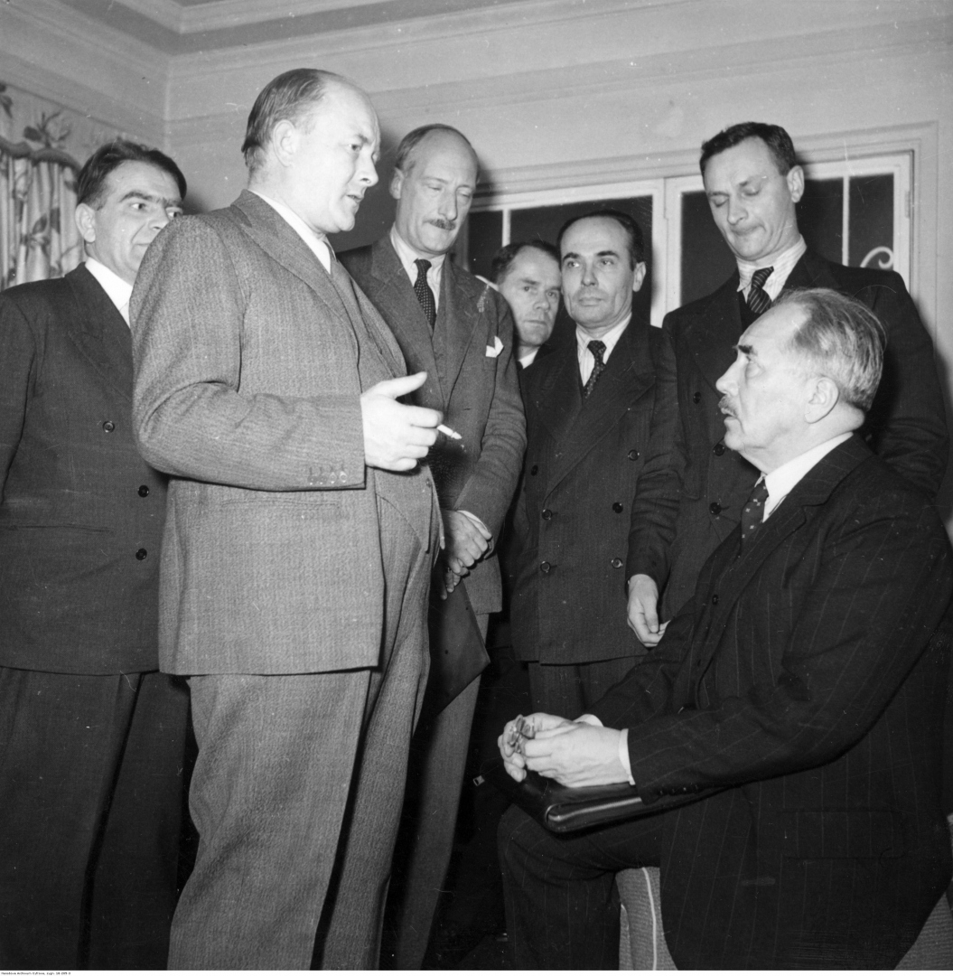 Od lewej: Paweł Siudak, premier Stanisław Mikołajczyk, dyrektor Adam Romer, NN, NN, NN, minister Stanisław Kot.