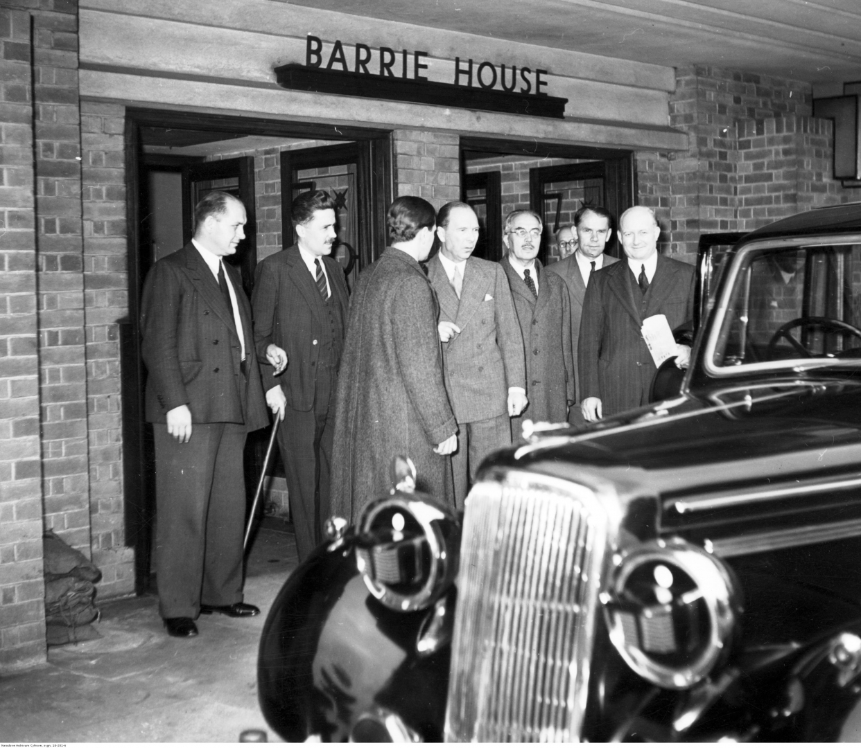 Od lewej: Franciszek Szeląg, poseł Witold Kulerski, NN, NN, minister Stanisław Kot, NN, NN, premier Stanisław Mikołajczyk.
