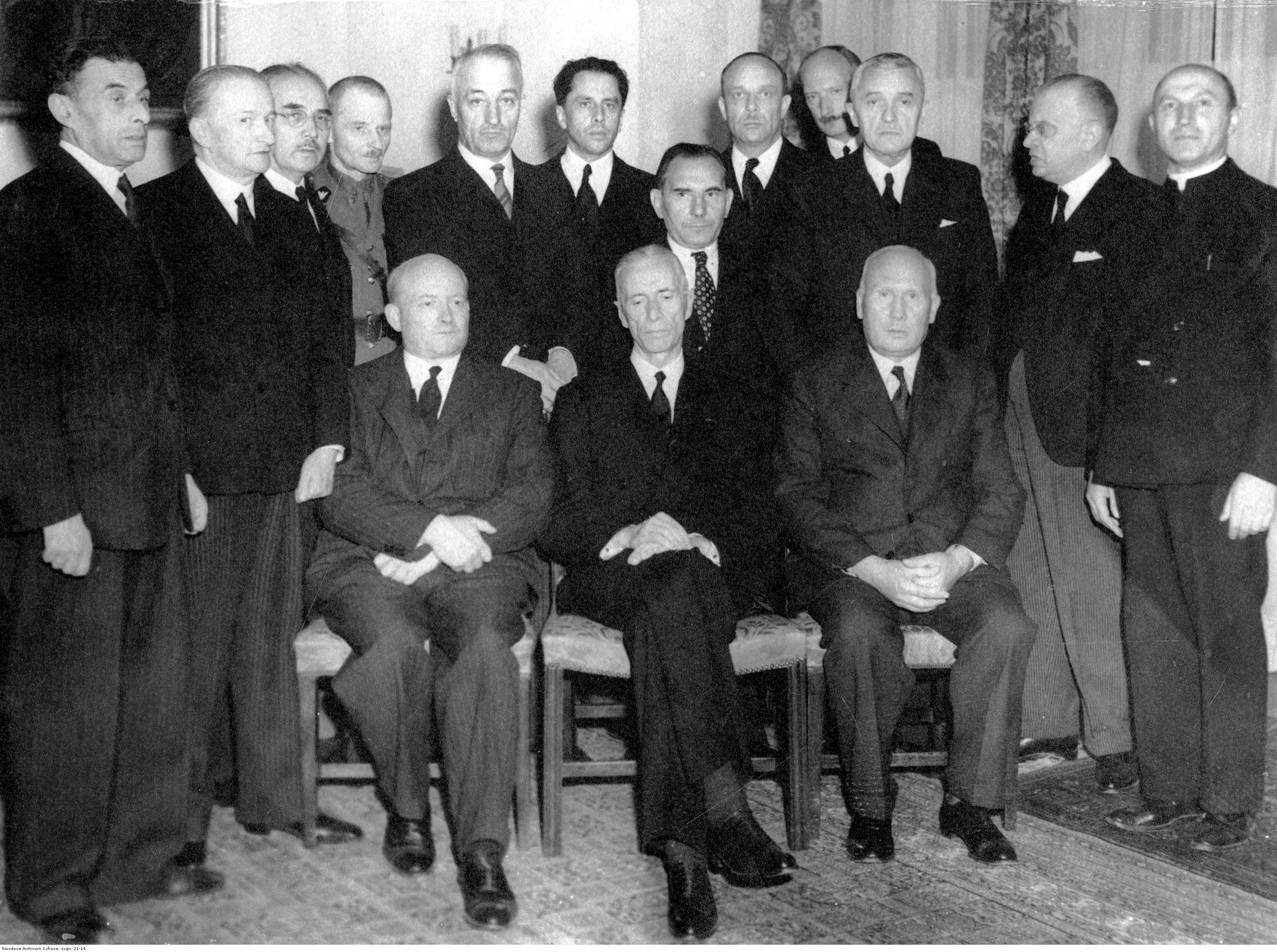 Siedzą od lewej: premier Stanisław Mikołajczyk, prezydent Władysław Raczkiewicz, wicepremier i minister przemysłu, handlu i żeglugi Jan Kwapiński. Stoją od lewej: minister skarbu Ludwik Grosfeld, minister bez teki Henryk Strasburger, minister informacji i dokumentacji Stanisław Kot, minister obrony narodowej gen. Marian Kukiel, minister bez teki Karol Popiel, minister spraw zagranicznych Tadeusz Romer, minister pracy i opieki społecznej Jan Stańczyk, minister spraw wewnętrznych Władysław Banaczyk, dyrektor Biura Prezydialnego Rady Ministrów Adam Romer, minister spraw kongresowych Marian Seyda, minister sprawiedliwości Wacław Komarnicki, minister wyznań religijnych i oświecenia publicznego ksiądz Zygmunt Kaczyński.