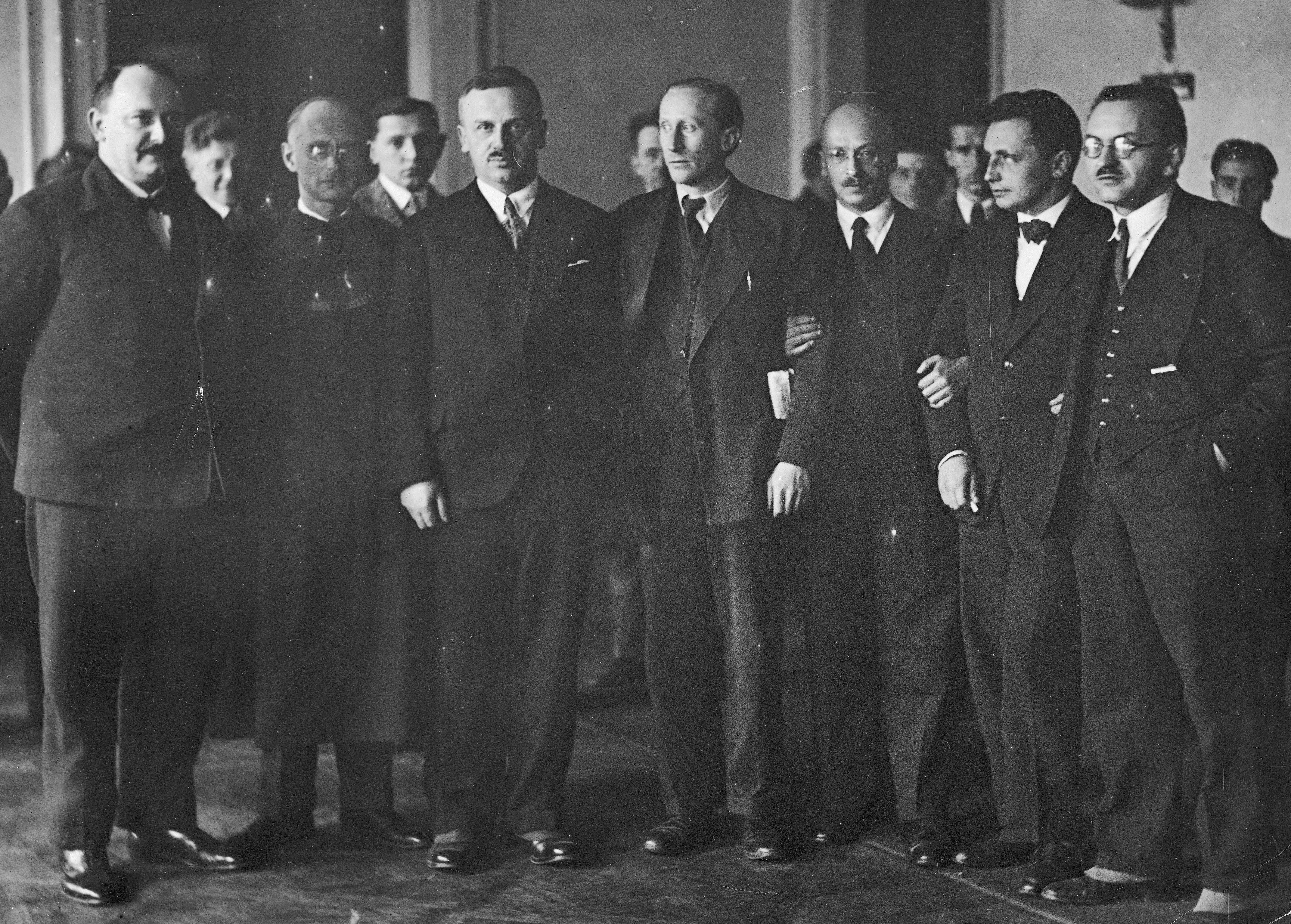 Grupa mężczyzn w kuluarach sądowych. Stoją w pierwszym rzędzie od lewej: oskarżony Mieczysław Mastek, adwokat Mieczysław Rudziński, świadek adwokat Rozencwajg, redaktor Wohnout, oskarżony Adam Pragier, oskarżony Stanisław Dubois i oskarżony Adam Ciołkosz.