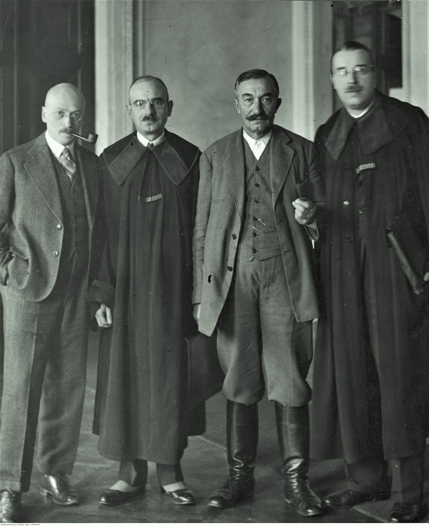 Na zdjęciu w kuluarach sądu  mieszczącym się w pałacu Paca przy ulicy Miodowej 15 widoczni są (od lewej): oskarżony Adam Pragier, adwokat Aleksander Dębski, oskarżony Wincenty Witos i świadek obrony Józef Chaciński  w kuluarach sądowych.