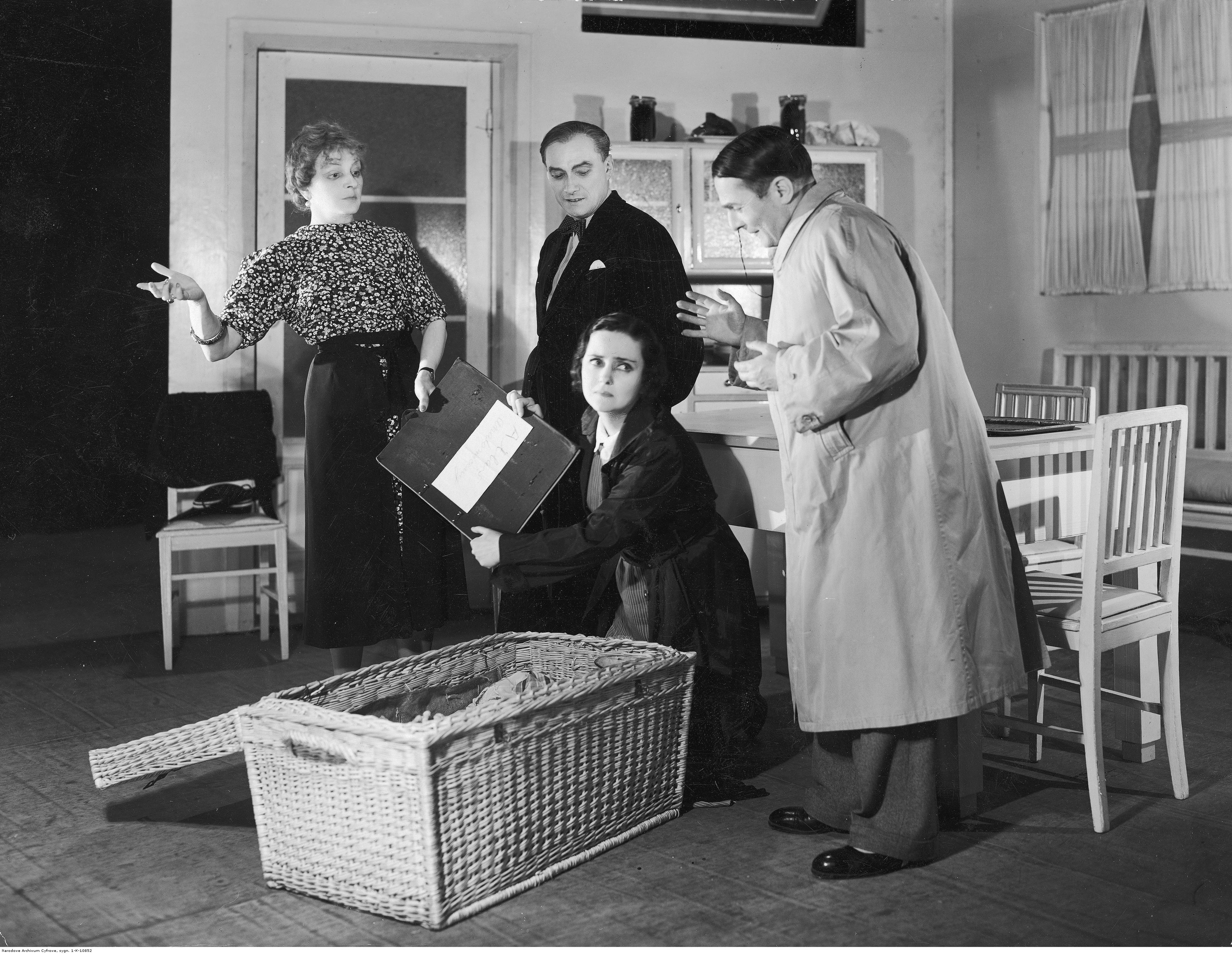 Na scenie widoczni (od lewej): Maria Gella, Antoni Różycki, Zofia Lindorfówna (klęczy), Stanisław Daczyński.