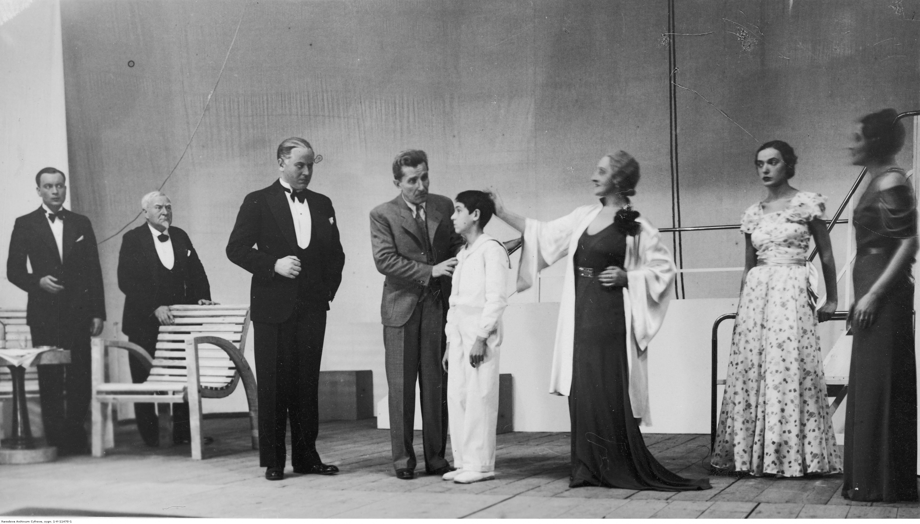 Na scenie widoczni są (od lewej): Zdzisław Mrożewski, Leon Wołłejko, Wacław Zastrzeżyński, Mieczysław Szpakiewicz w roli Ludwika, Olszewski, Irena Detkowska-Jasińska, Stanisława Masłowska, Halina Drohocka.